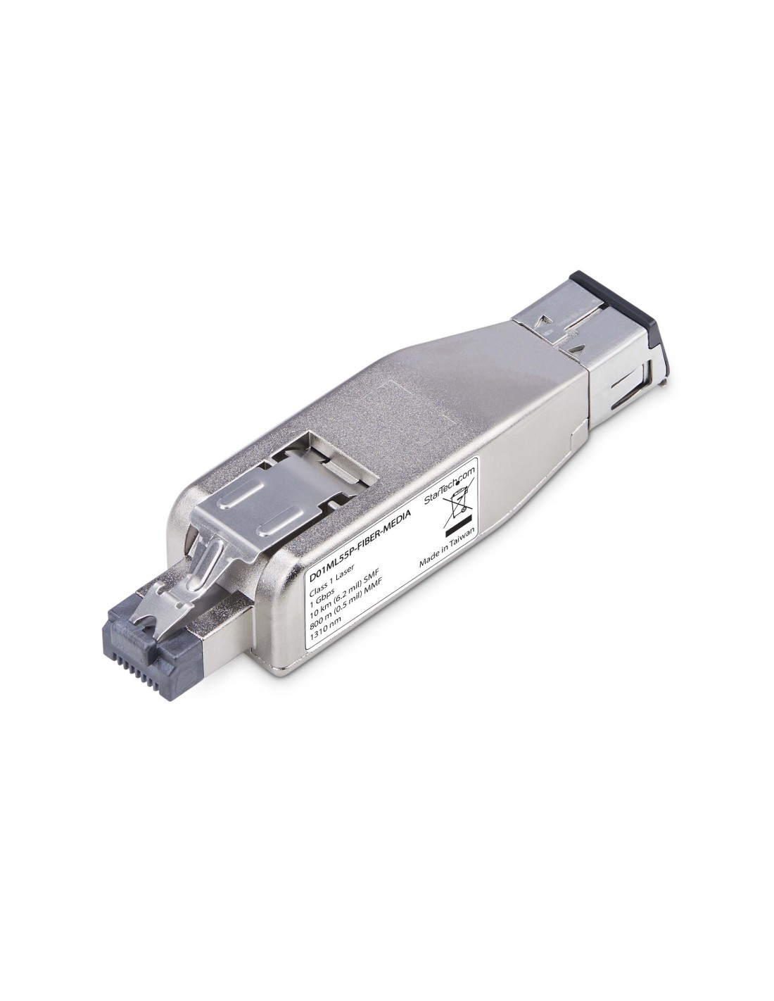 StarTech.com Dongle convertitore multimediale da fibra Gigabit a RJ45 Ethernet, monomodale ottico 10 km/multimodale 800 m, alimentato da PoE, design compatto, alloggiamento in metallo, micro mini, TAA. Velocità massima di trasferimento dati: 1000 Mbit/s, interfaccia convertitore input: 1000Base-T, interfaccia convertitore output: 1000Base-LX. Distanza massima di trasferimento: 10000 m, Lunghezza d'onda: 1310 nm, Struttura della modalità di fibra: Modalità multipla, Modalità singola. Indicatori LED: Attività, Collegamento, Potenza, Colore del prodotto: Argento, Materiale della scocca: Metallo. Connettore a fibra ottica: LC, Tecnologia di connessione: Cablato. Consumi: 2,5 W