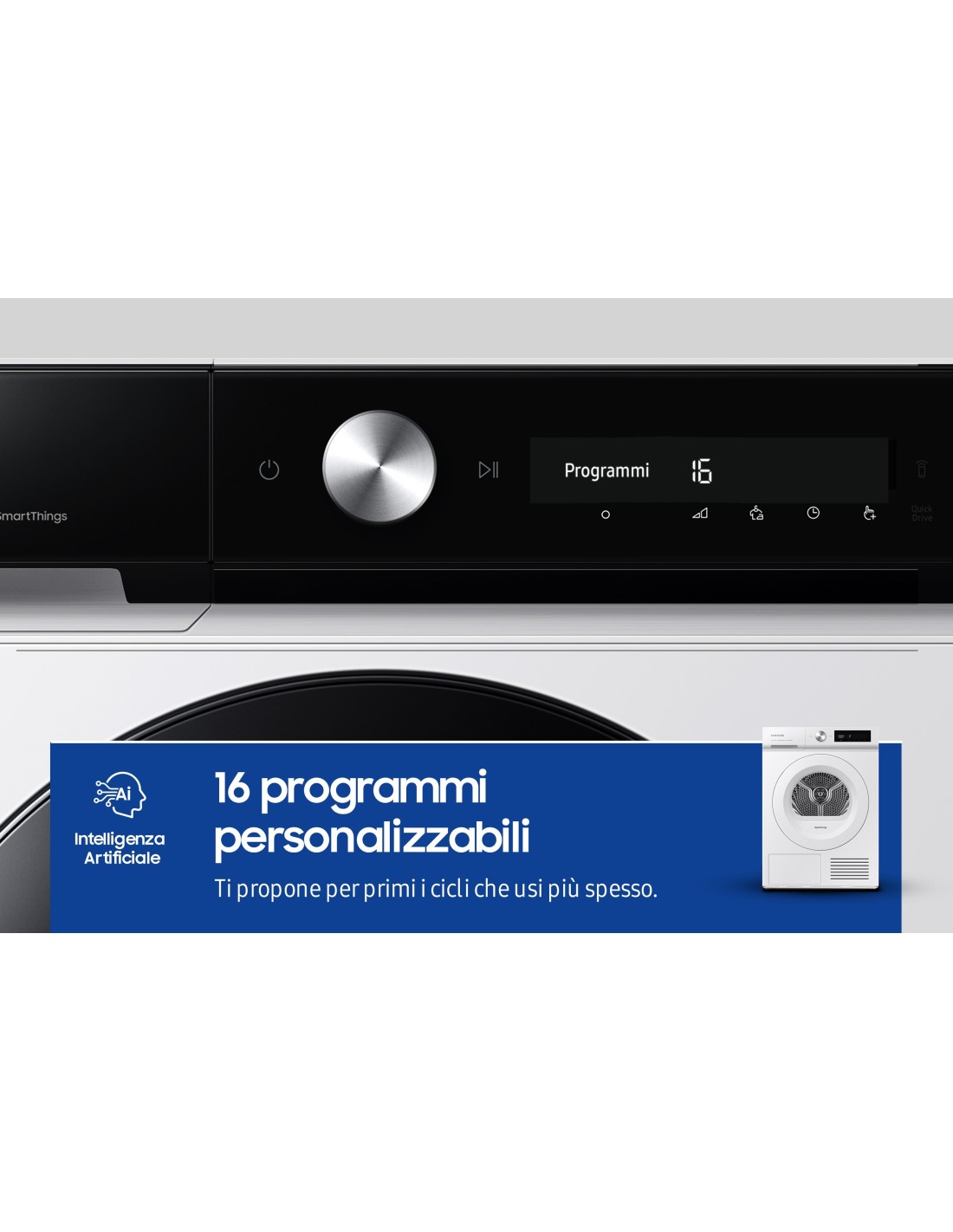 Trasforma l’asciugatura in un’esperienza personalizzata, efficiente e a prova di problemi con l’app SmartThings*. Analizzando le tue abitudini**, l’opzione “Clothing Care” ti consiglia il ciclo ideale da impostare***. “Energy” ti aiuta a gestire l’energia con un approccio olistico. E “Home Care” mantiene l’asciugatrice in condizioni sempre ottimali.