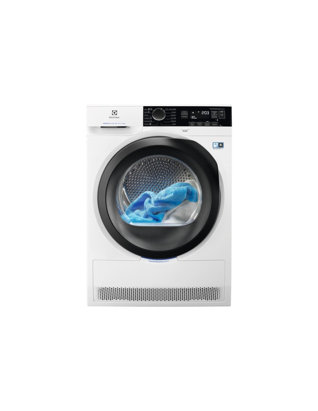 Perfectcare 900 con Tecnologia Cyclonecare SystemLa nostra asciugatrice PerfectCare 900 con CycloneCare System consente ai tuoi vestiti di essere protetti, asciugati in modo uniforme come all'aria aperta. Infine, una tecnologia unica sul mercato che garantisce la perfetta conservazione della forma, della sensazione e dell'aspetto del tuo stile.