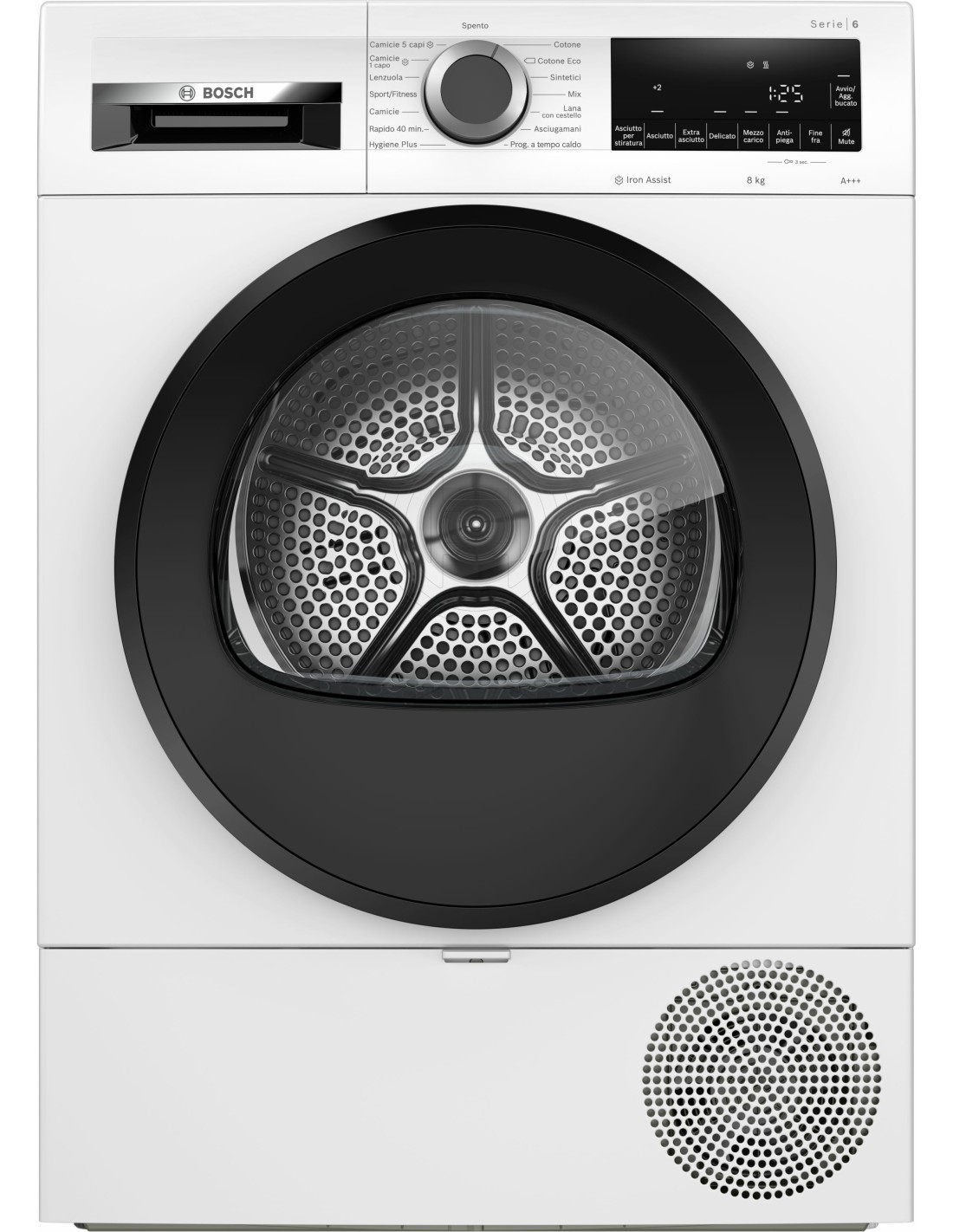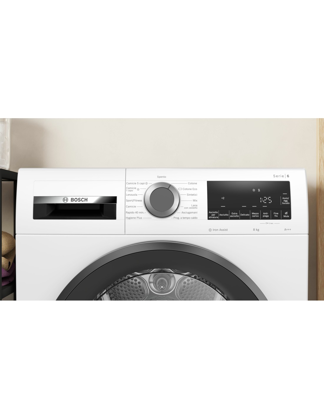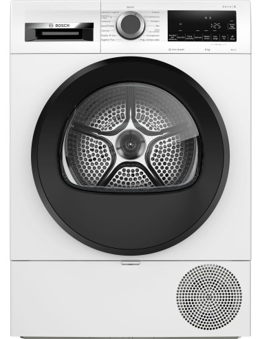 Bosch Serie 6 WQG233C0IT Asciugatrice a pompa di calore 8 kg Classe A+++. Posizionamento dell'apparecchio: Libera installazione, Tipo di carica: Caricamento frontale, Sistema di asciugatura: Pompa di calore. Capacità cestello: 8 kg, Programmi di asciugatura: Biancheria da letto, Camicia/maglietta, Cotone, Eco, Hygienic freshen-up, Ferro da stiro a secco,..., Ciclo: 165 min. Partenza ritardata: 24 h, Regolazione piedini: 1,5 cm. Consumo energetico: 1,4 kWh, Consumo energetico annuo: 176 kWh, Fonte di calore: Elettrico/Gas. Profondità: 613 mm, Larghezza: 598 mm, Altezza: 842 mm