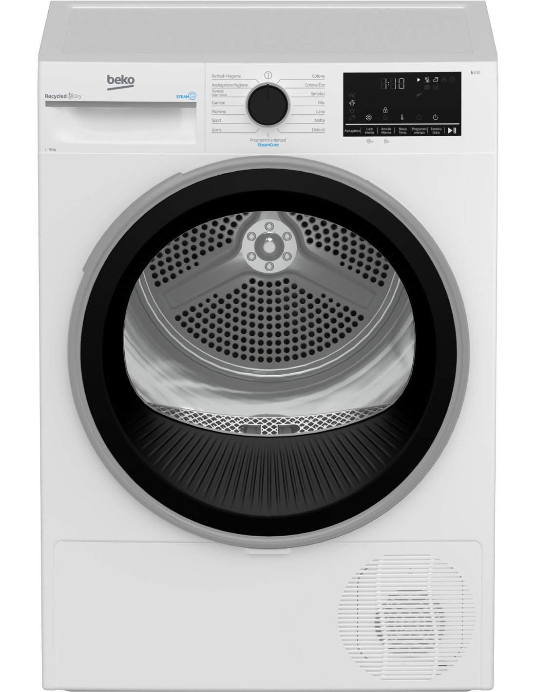 Beko BT3103IS_IT 10kg, Classe C, motore inverter, Display digitale XL, funzione a vapore SteamCure™, colore Bianco, oblò Nero. Posizionamento dell'apparecchio: Libera installazione, Tipo di carica: Caricamento frontale, Sistema di asciugatura: Pompa di calore. Capacità cestello: 10 kg, Classe di efficienza della condensazione: B, Programmi di asciugatura: Cotone, Cotton eco, Delicati/Seta, Piumino/piumone, Hygienic drying, Hygienic freshen-up,.... Classe efficienza energetica: C, Consumo energetico per 100 cicli: 117 kWh, Consumo energetico annuo: 217 kWh. Tecnologie Beko (cura dei vestiti): OptiSense. Profondità: 670 mm, Larghezza: 598 mm, Altezza: 846 mm
