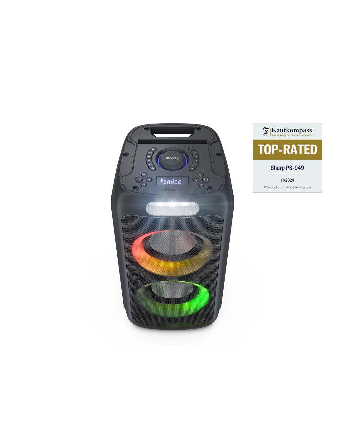 Sharp PS-949. Sistema audio: 2.1 canali, Diametro del woofer: 20,3 cm (8"). PMPO (Potenza musicale di picco): 132 W. Tecnologia di connessione: Con cavo e senza cavo, Profili Bluetooth: A2DP, AVRCP. Tipo di prodotto: Altoparlante da festa, Colore del prodotto: Nero, Materiale della scocca: Plastica. Utilizzo raccomandato: Universale, Certificazione: CE (RED, RoHS, ErP), REACH/PAH/SCCP