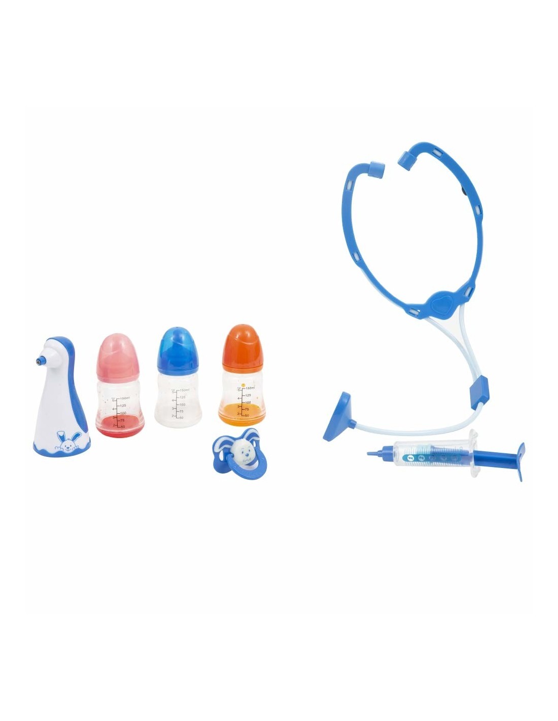 La confezione include: 1 termometro, 3 biberon, 1 siringa, 1 ciuccio e uno stetoscopio.