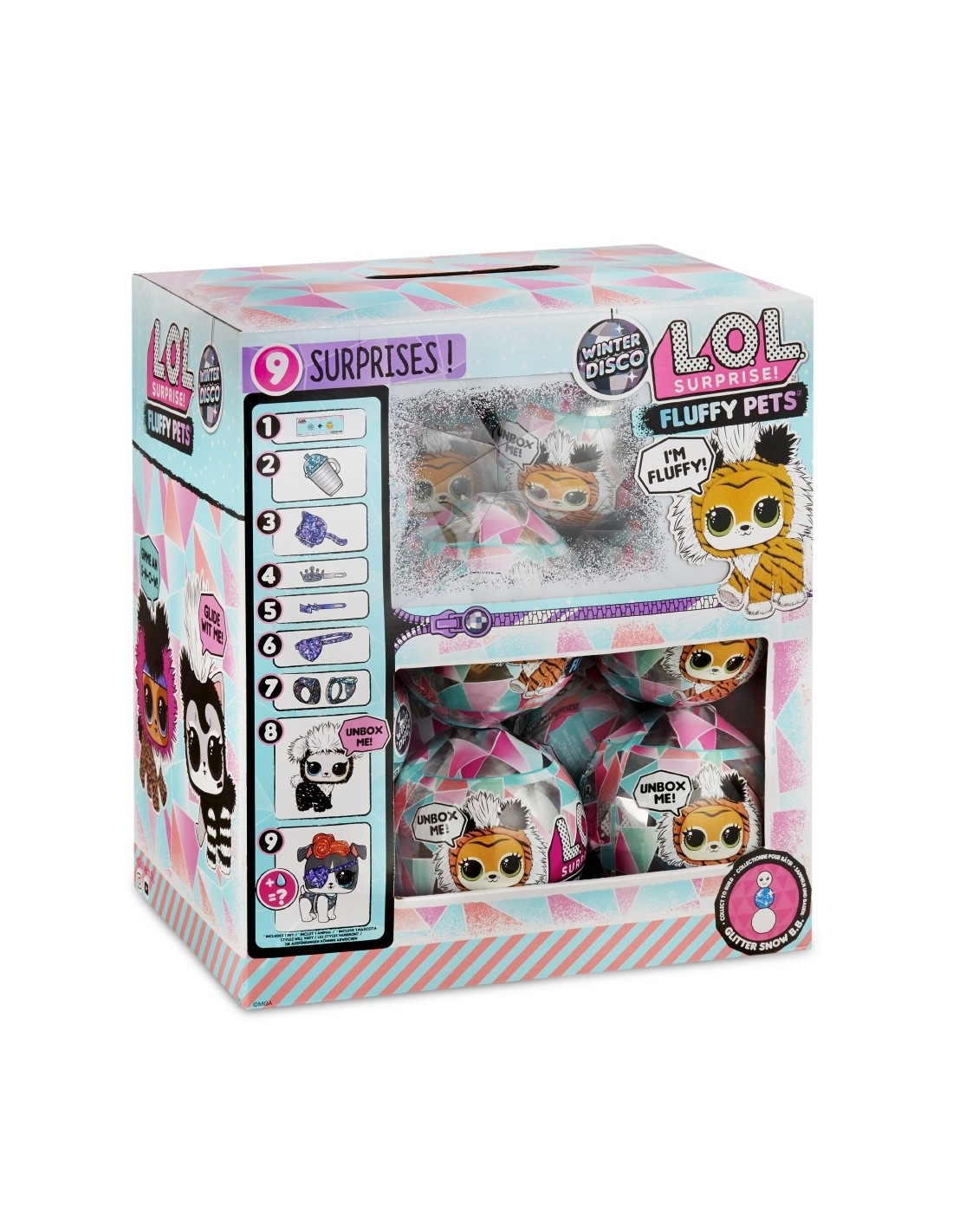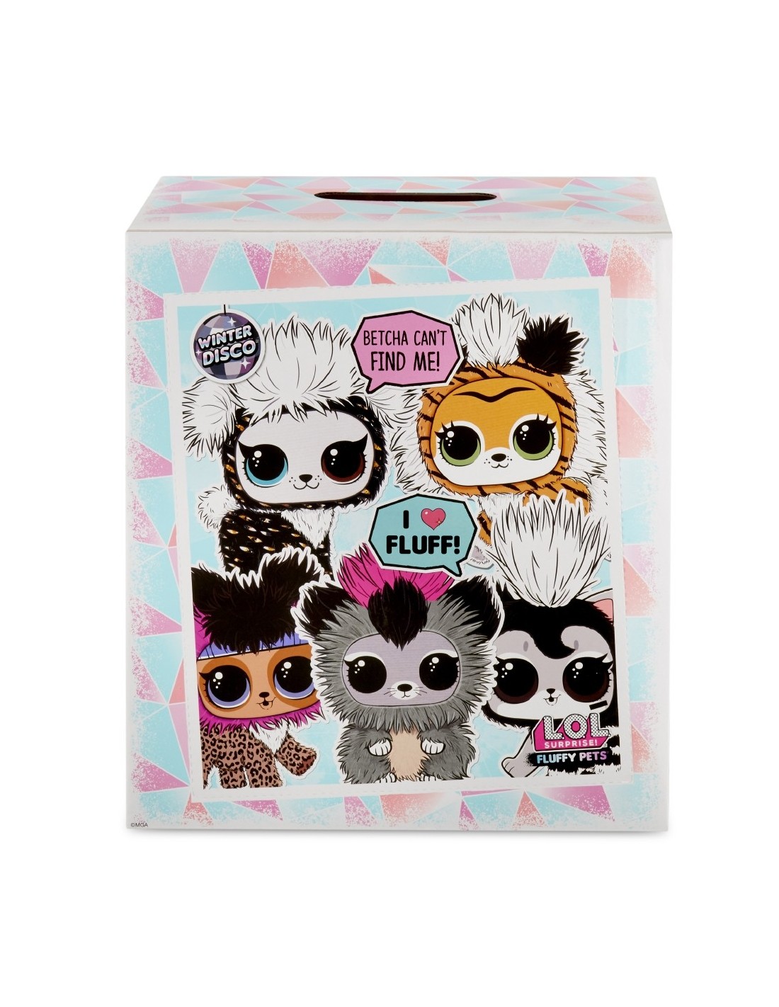 Surprise! LOL Fluffy Pets Winter Disco. Tipo di prodotto: Personaggio da collezione, Sulla base dei: Film e serie TV, Pubblico di destinazione: Bambini. Larghezza imballo: 96,5 mm, Profondità imballo: 99,1 mm, Altezza imballo: 101,6 mm. Tipo di imballo: Scatola finestra, Quantità per pacco: 1 pz