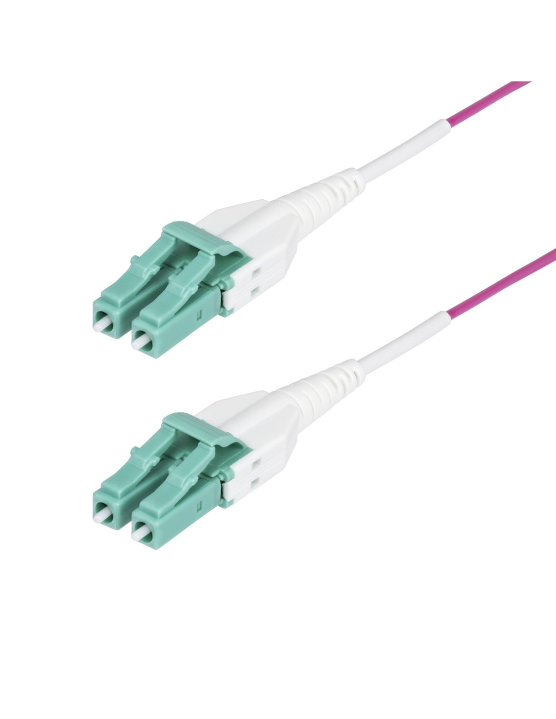 Questo cavo patch in fibra ottica duplex multimodale da LC a LC OM4 offre una connettività affidabile su reti da 40 e 100 Gigabit. La guaina viola erica conforme a TIA distingue chiaramente il cablaggio OM4 da quello verde acqua OM3, eliminando le incertezze nelle configurazioni di rete. Il design compatto del connettore uniboot consente un facile inserimento e rimozione in installazioni ad alta densità.
