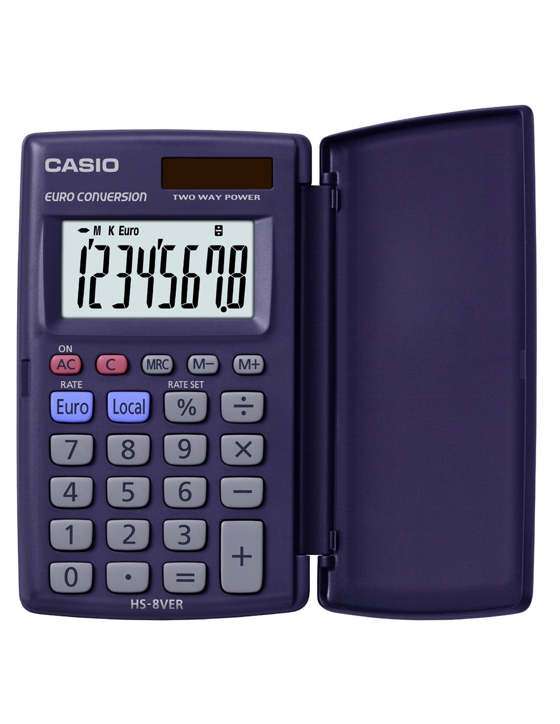Casio HS-8VER. Fattore di forma: Tasca, Tipo: Calcolatrice di base. Cifre: 8 cifre, Righe di testo: 2 linee. Convertitore di valute, Calcolatore tasse, Calcolo del profitto. Alimentazione: Batteria/Solare. Copertura, Colore del prodotto: Blu