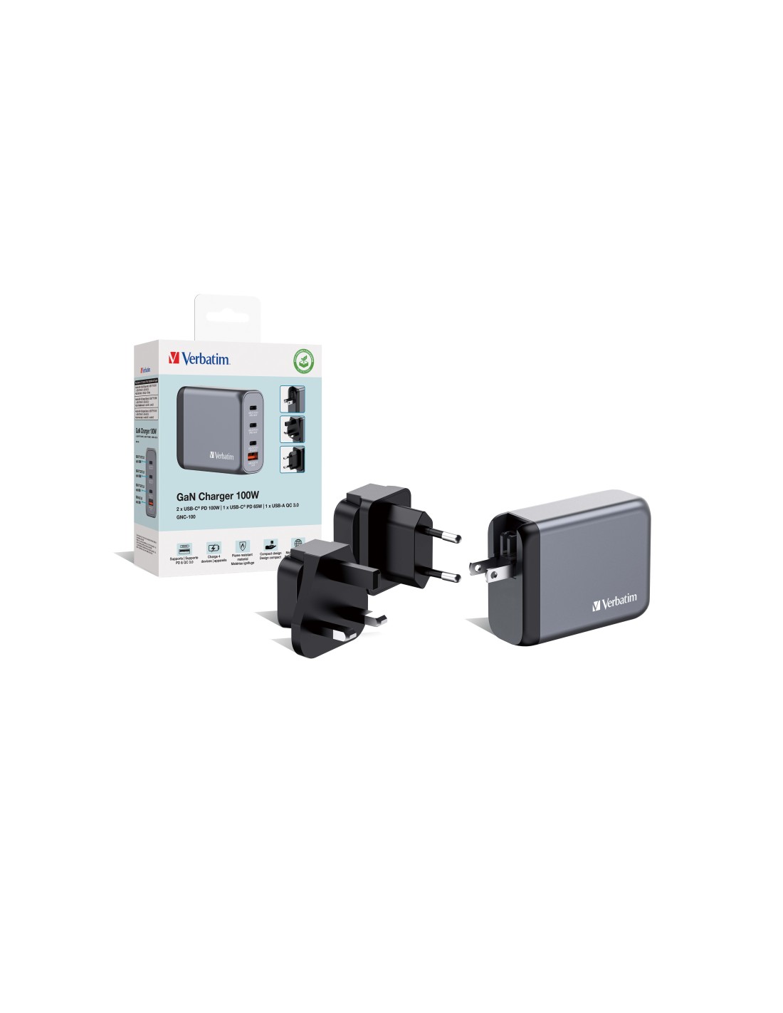 Verbatim GNC-100. Tipo di caricatore: Interno, Tipologia alimentazione: AC, Compatibilità caricatore: Universale. Voltaggio di ingresso: 100 - 240 V, Tensione di uscita (max): 20 V. Quantità di porte USB Tipo C: 3, Ricarica rapida, Funzionalità di protezione dell'alimentazione: Sovracorrente, Sovraccarico, Surriscaldamento, Cortocircuito. Colore del prodotto: Nero, Grigio
