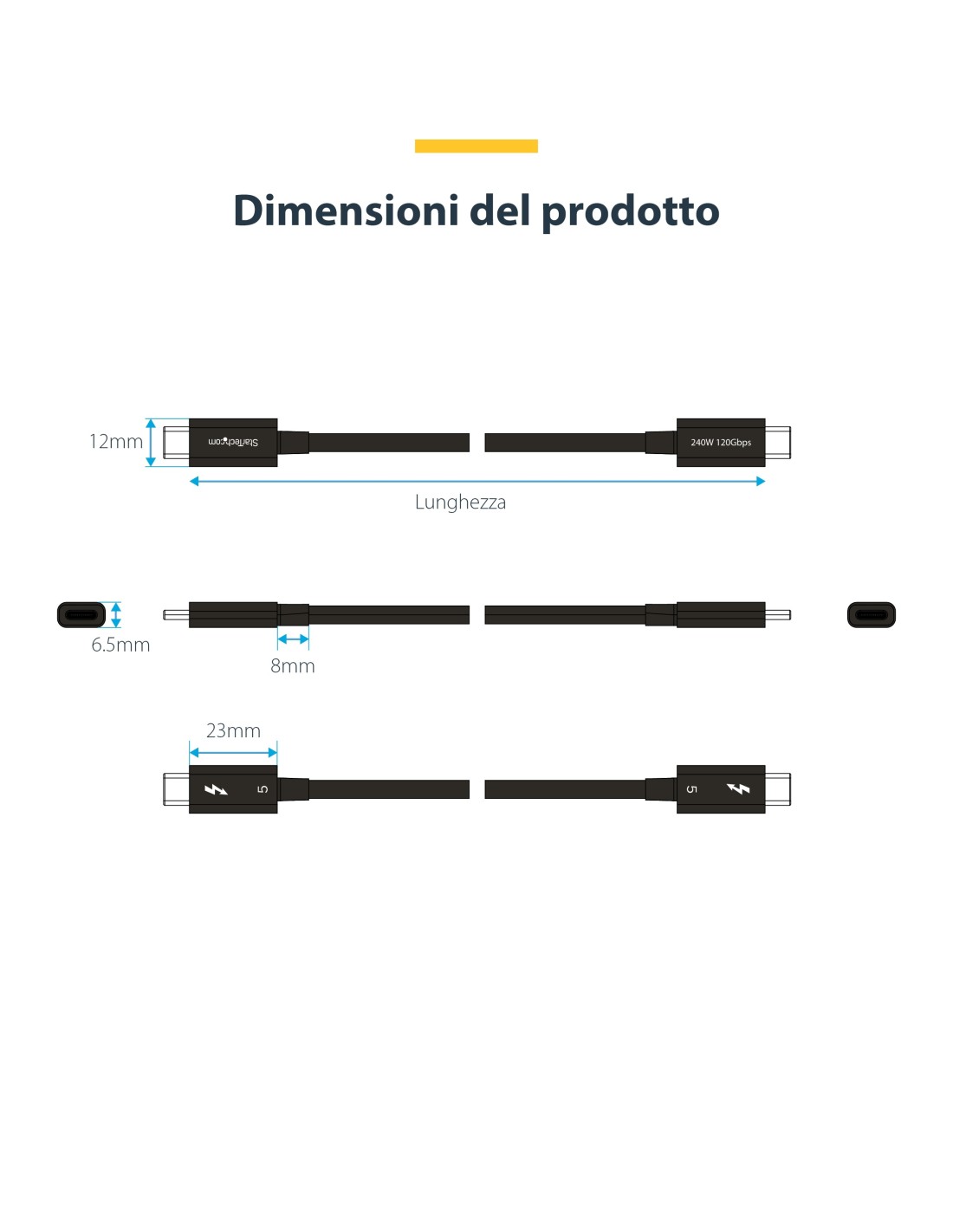 StarTech.com Cavo Thunderbolt 5 80 Gbps/fino a 120 Gbps da 1m, 240 W PD, 8K 60 Hz, cavo Thunderbolt certificato - Compatibile con Thunderbolt 4/USB4/USB-C. Connettore 1: Maschio, Connettore 2: Maschio, Lunghezza cavo: 1 m. Certificati di conformità: CE, Federal Communications Commission (FCC), RoHS. Diametro del cavo: 4,6 mm. Quantità per pacco: 1 pz, Larghezza imballo: 128 mm, Profondità imballo: 220 mm. Quantità per cartone principale: 60 pz, Lunghezza del cartone principale: 292 mm, Larghezza scatola principale: 435 mm