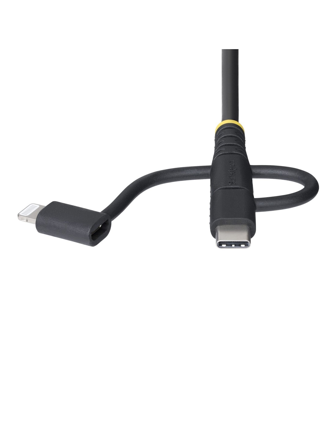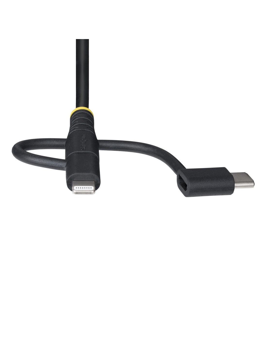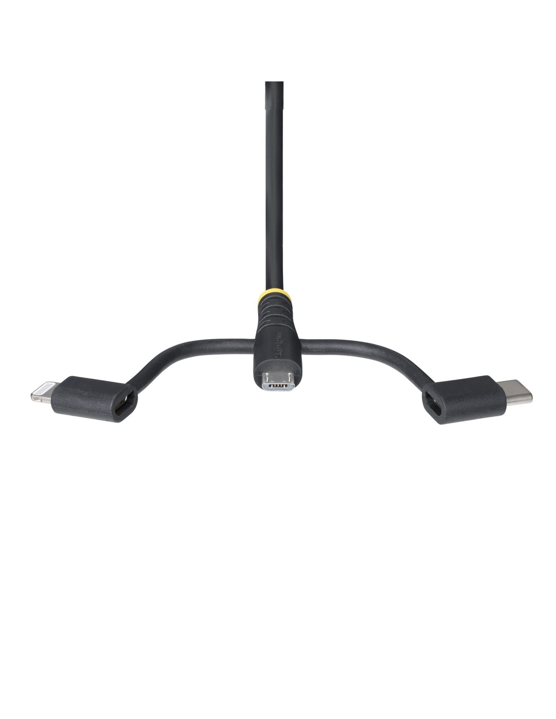 StarTech.com Cavo di Ricarica USB robusto da 1m, Da USB a Lightning/Micro-USB/Tipo-C, certificato Apple MFi, rivestimento in aramide, cavo universale di ricarica USB 3 in 1 per iPhone/iPad/Android. Lunghezza cavo: 1 m. Connettore 1: USB A, Connettore 2: Micro-USB B, Versione USB: USB 2.0, Massima velocità di trasferimento: 0,48 Gbit/s, Placcatura contatti: Nichel, Colore del prodotto: Nero