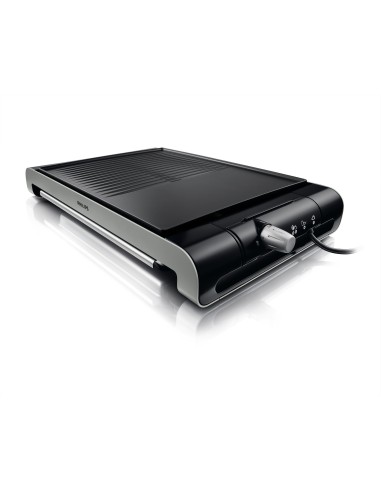 Philips Grill da tavolo da 2300 W con piastra scanalata/liscia. Colore del prodotto: Nero, Materiale della scocca: Alluminio, Indicatori LED: Pronto. Potenza: 2300 W, Tensione di ingresso AC: 220-240 V, Frequenza di ingresso AC: 50 - 60 Hz. Lunghezza cavo: 1 m, Peso: 4 kg