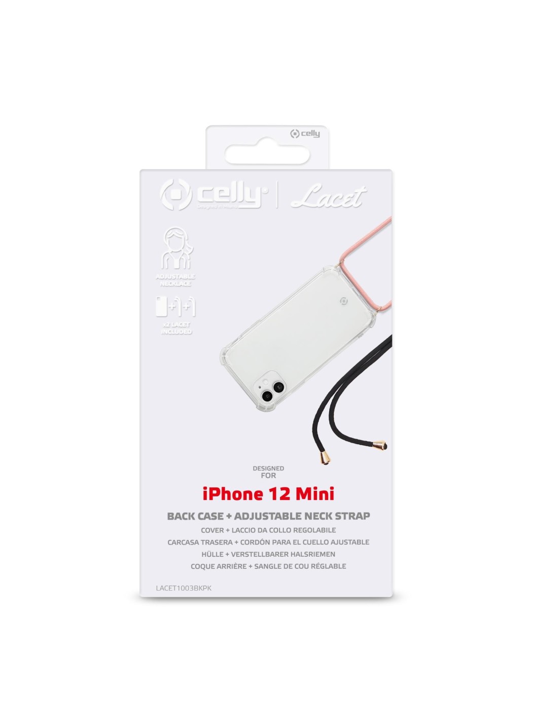 Celly Lacet. Tipologia custodia: Cover, Compatibilità marca: Apple, Compatibilità: iPhone 12 Mini, Capienza massima dimensioni dello schermo: 13,7 cm (5.4"), Colorazione superficie: Monocromatico, Colore del prodotto: Trasparente