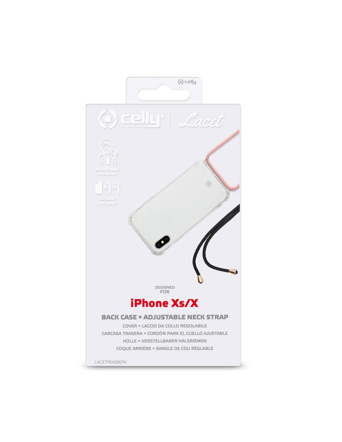 Celly Lacet. Tipologia custodia: Cover, Compatibilità marca: Apple, Compatibilità: iPhone XS/X, Capienza massima dimensioni dello schermo: 14,7 cm (5.8"), Colorazione superficie: Monocromatico, Colore del prodotto: Trasparente