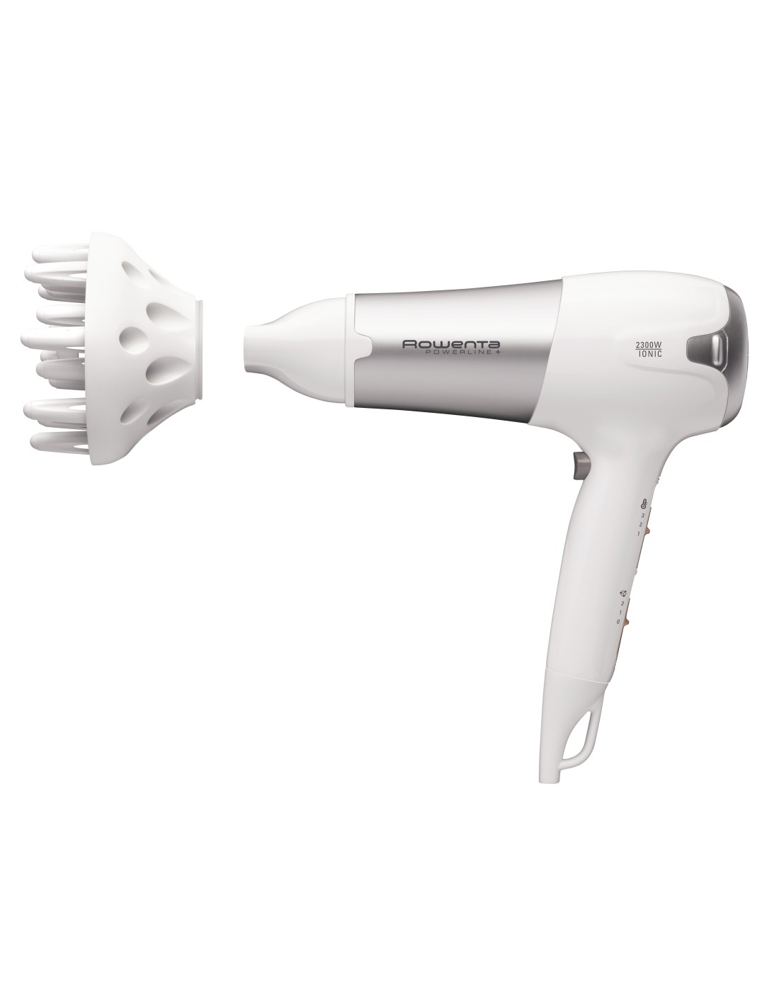 Rowenta CV5090F0 Powerline+ Asciugacapelli con Diffusore e Generatore di Ioni, Asciugatura Veloce, 2300 W, Argento/Bianco. Colore del prodotto: Argento, Bianco, Tipo di attaccatura: Anello di sospensione, Lunghezza cavo: 1,8 m. Potenza: 2300 W, Tensione di ingresso AC: 220-240 V
