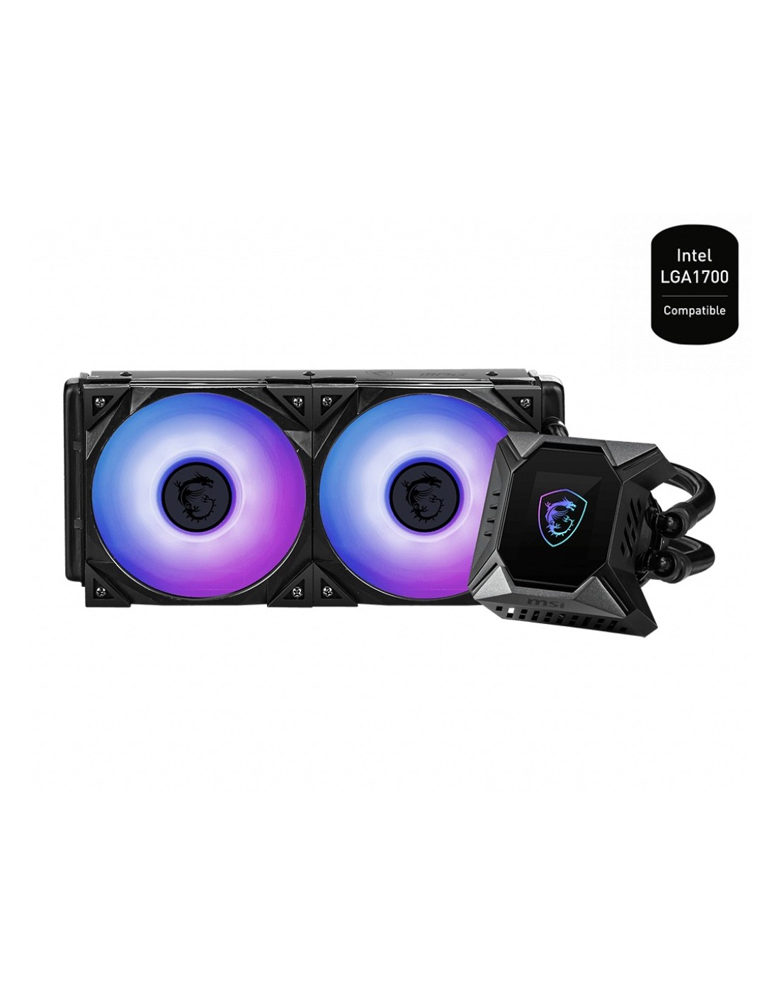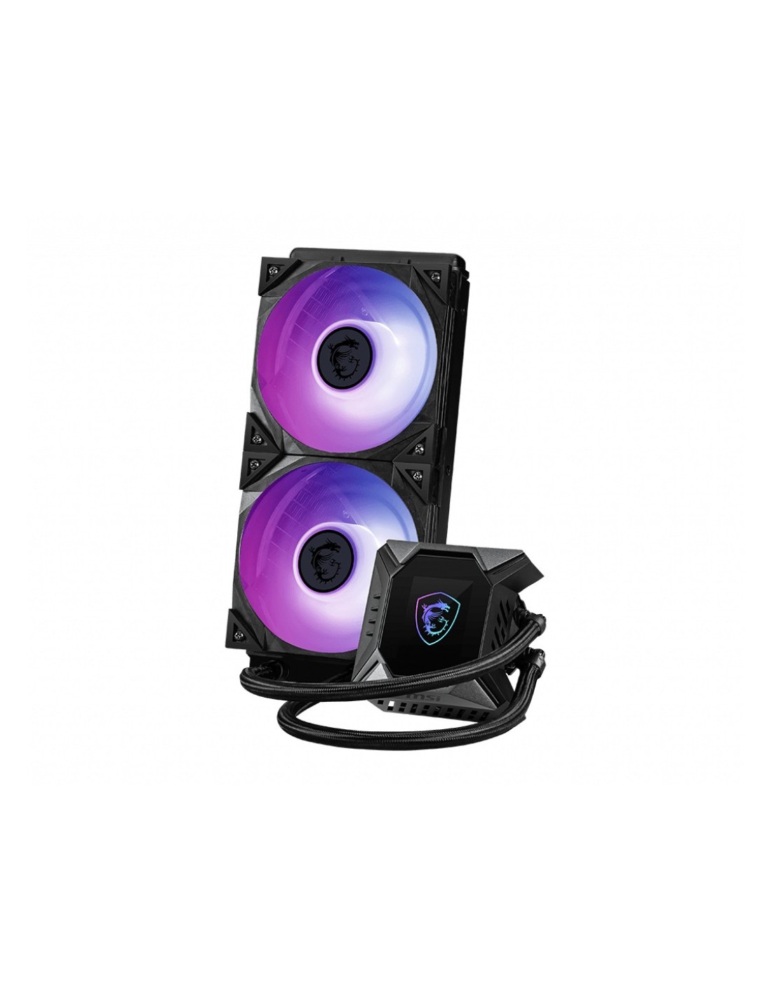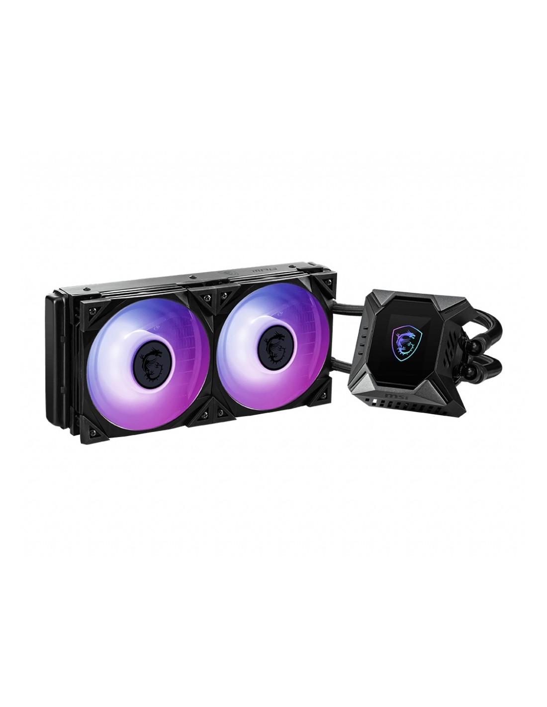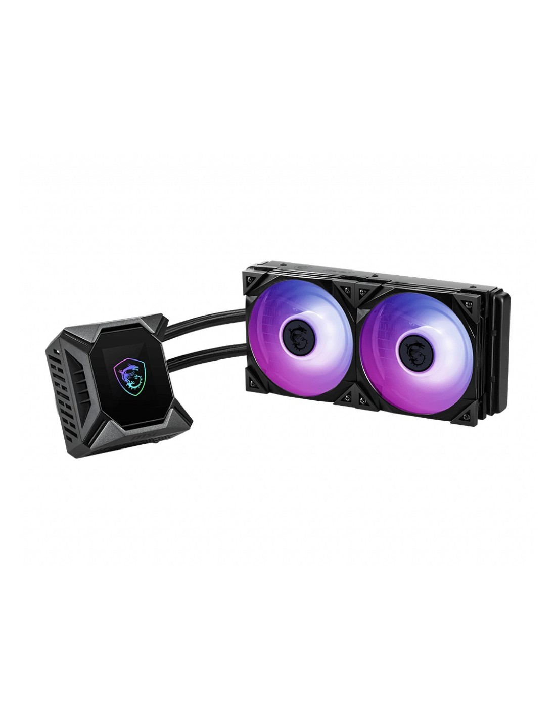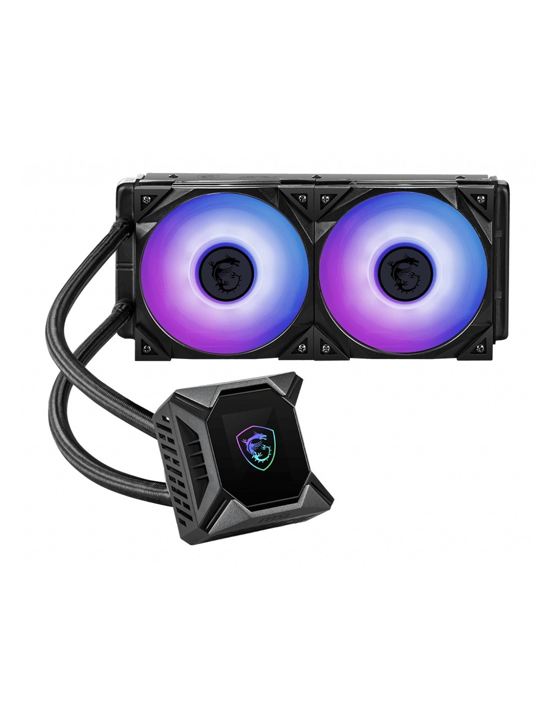 MSI MPG CORELIQUID K240 V2. Tipo: Set refrigerante, Diametro del ventilatore: 12 cm, Velocità (massima) di rotazione: 2500 Giri/min, Rumorosità (velocità alta): 39,9 dB, flusso d'aria massimo: 77,4 pdc/min, pressione dell'aria massima: 4,29 mmH2O, Tipo di cuscinetto: Cuscinetto a sfera. Colore del prodotto: Nero