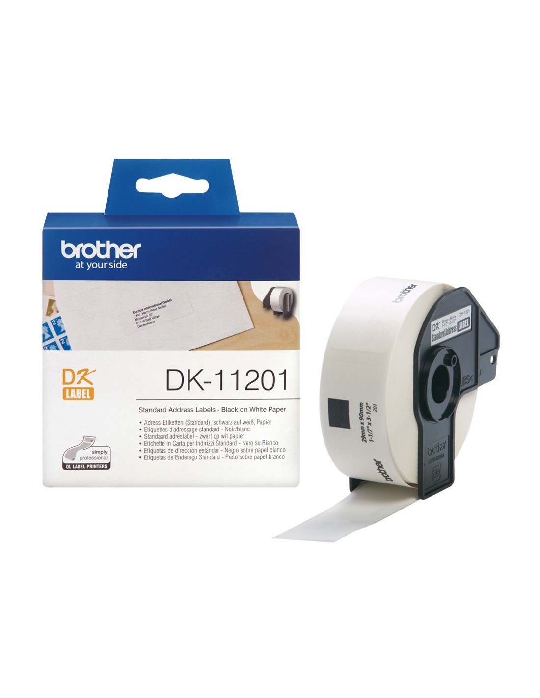 Brother Etichette per indirizzi standard. Colore etichetta: Nero su bianco, Etichette per rotolo: 400 pz, Tipo nastro: DK. Larghezza: 29 mm, Profondità: 90 mm, Larghezza imballo: 115 mm