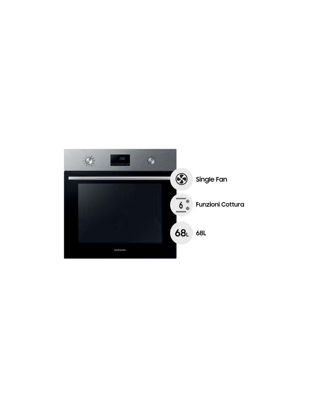Samsung NV68A1110BS. Dimensione del forno: Media, Tipo di forno: Forno elettrico, Capacità interna forno totale: 68 L. Posizionamento dell'apparecchio: Da incasso, Colore del prodotto: Acciaio inossidabile, Tipo di controllo: Manopola, Touch. Tipo di orologio: Elettronico, Tipo di timer: Digitale. Classe efficienza energetica: A, Consumo energetico (convenzionale): 0,99 kWh, Consumo energetico (convezione forzata): 0,8 kWh. Quantità lampade: 1 lampada(e), Tipo di lampada: Alogena, posizione delle illuminazioni: Posteriore
