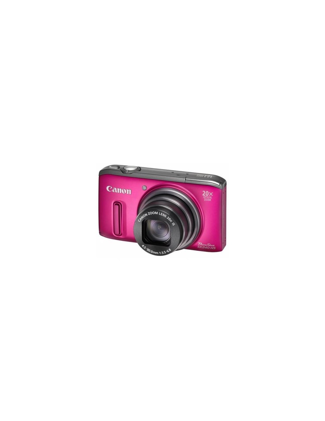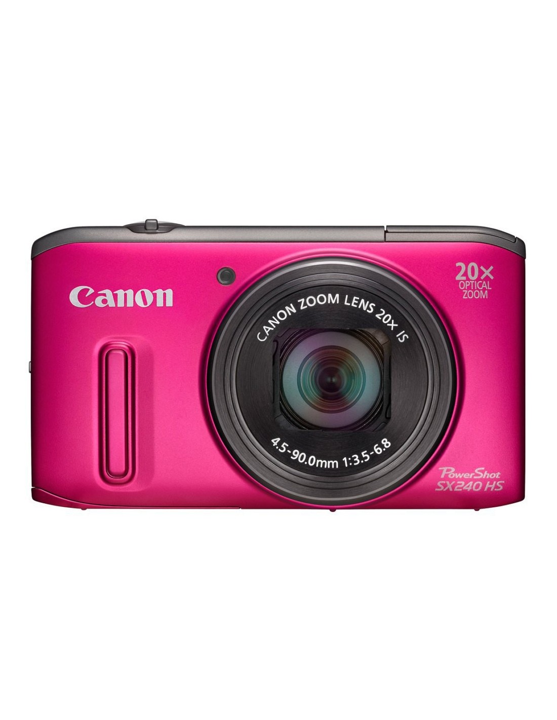 Canon PowerShot SX240 HS. Tipologia fotocamera: Fotocamera compatta, Megapixel: 12,1 MP, Dimensione del sensore di immagine: 1/2.3", Tipo sensore: CMOS, Risoluzione massima immagine: 4000 x 3000 Pixel. Sensibilità ISO (max): 3200. Zoom ottico: 20x, Zoom digitale: 4x, Lunghezza focale: 4.5 - 90 mm. Tipologia HD: HD, Risoluzione massima video: 1920 x 1080 Pixel. Dimensioni schermo: 7,62 cm (3"). PictBridge. Peso: 208 g. Colore del prodotto: Rosa