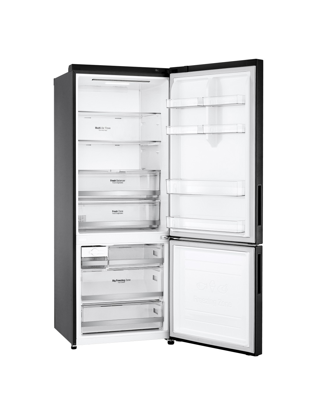 LG GBB569MCAMN.AMCQEUT. Capacità netta totale: 462 L, Classe climatica: SN-T, Emissione acustica: 41 dB. Capacità netta frigorifero: 329 L, No Frost (frigorifero), Sistema Multi-Airflow (frigorifero), Luce interna, Numero di ripiani frigorifero: 1. Capacità netta congelatore: 133 L, Capacità di congelamento: 7 kg/24h, No Frost (congelatore). Compartimento zona fresca. Classe efficienza energetica: E, Consumo energetico annuo: 282 kWh. Colore del prodotto: Nero