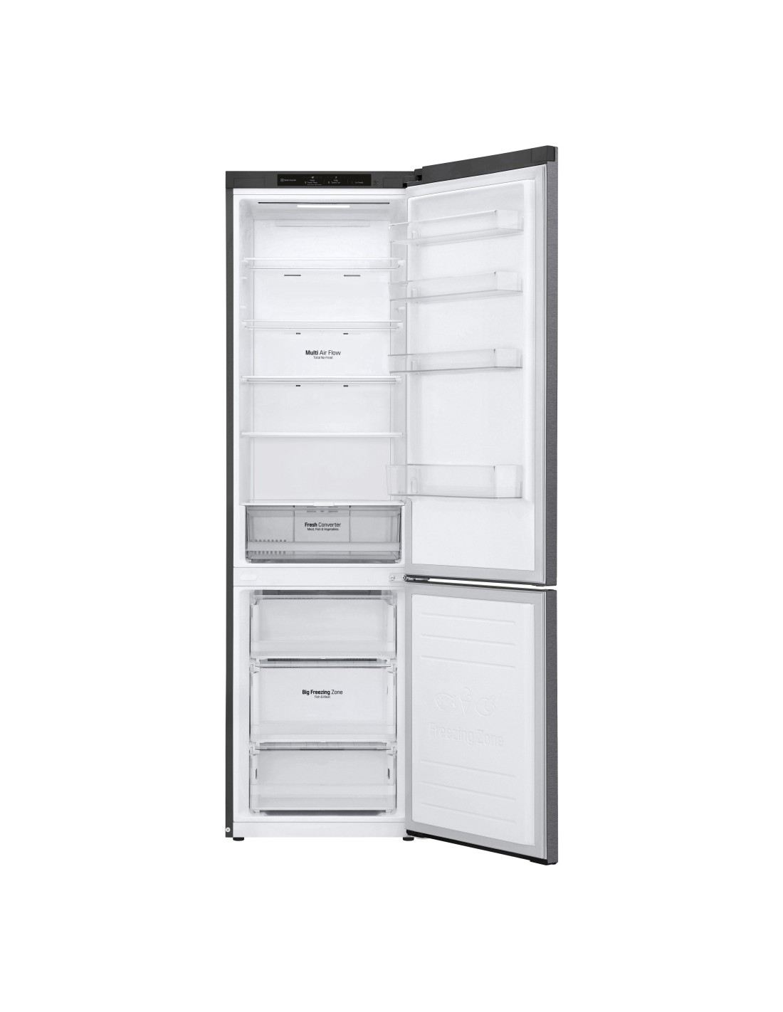LG GBP62DSSGR. Capacità netta totale: 384 L. Cerniera porta: Destra, Tipo di display: LED. Classe climatica: SN-T, Emissione acustica: 35 dB. Capacità netta frigorifero: 233 L, No Frost (frigorifero), Sistema Multi-Airflow (frigorifero), Luce interna. Capacità netta congelatore: 107 L, Capacità di congelamento: 10 kg/24h, No Frost (congelatore). Classe efficienza energetica: D, Consumo energetico annuo: 215 kWh. Colore del prodotto: Grafite