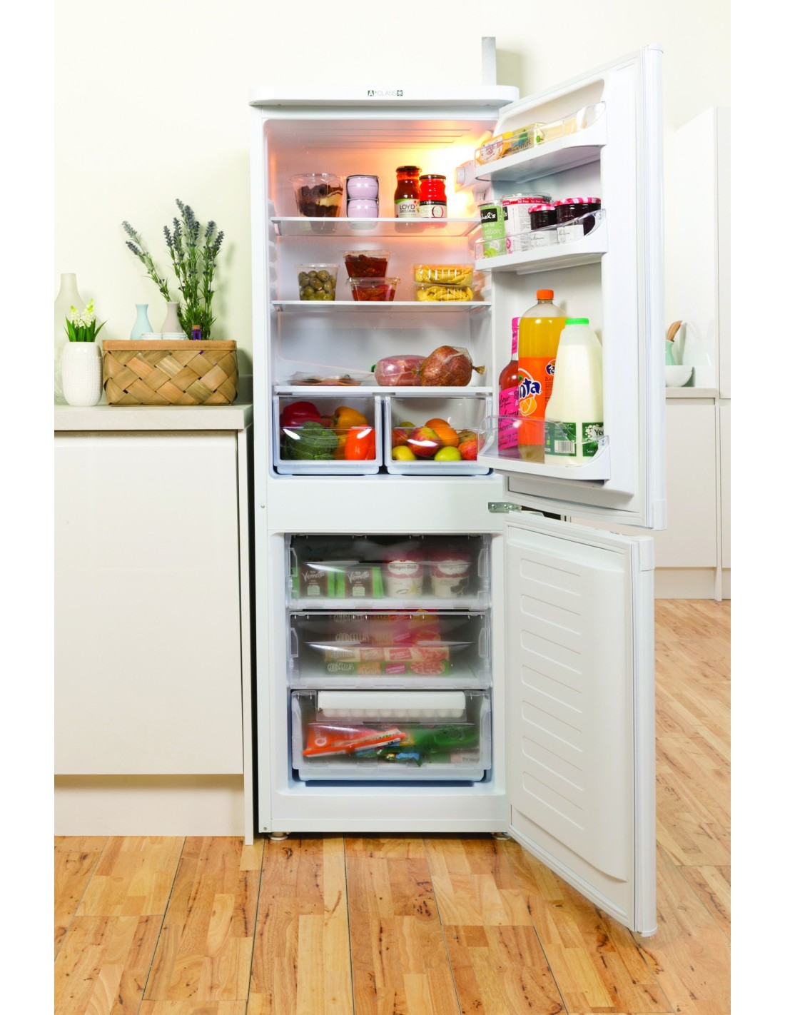 Indesit NCAA 55 Combinato. Capacità netta totale: 228 L. Cerniera porta: Destra. Classe climatica: SN-T, Emissione acustica: 43 dB. Capacità netta frigorifero: 154 L, Luce interna, Numero di ripiani frigorifero: 3, Numero di cassetti per verdura: 2. Capacità netta congelatore: 74 L, Capacità di congelamento: 2,5 kg/24h. Classe efficienza energetica: F, Consumo energetico annuo: 263 kWh. Colore del prodotto: Bianco