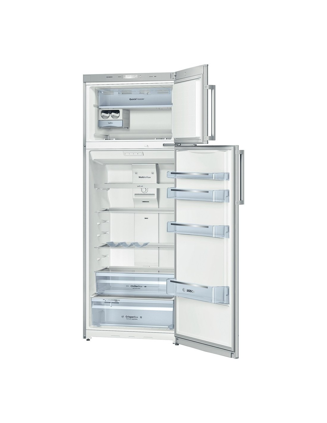Bosch Serie 4 KDN46VL20 Doppia porta. Capacità netta totale: 371 L. Cerniera porta: Destra. Classe climatica: SN-T, Emissione acustica: 43 dB. Capacità netta frigorifero: 294 L, No Frost (frigorifero), Sistema Multi-Airflow (frigorifero), Luce interna, Numero di ripiani frigorifero: 4. Capacità netta congelatore: 77 L, Capacità di congelamento: 8 kg/24h, No Frost (congelatore). Compartimento zona fresca. Consumo energetico annuo: 337 kWh. Colore del prodotto: Acciaio inossidabile