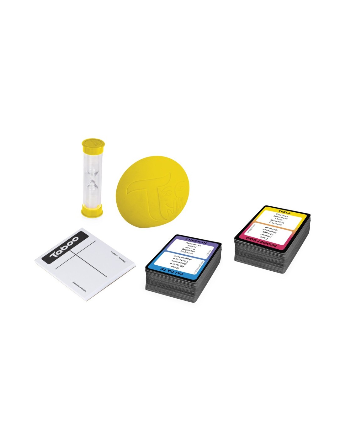 Taboo, il gioco delle parole vietate! Fai in modo che la tua squadra indovini la parola misteriosa senza dire nessuna delle parole vietate! Chi riesce a far indovinare ai propri compagni di squadra la parola "Fama" senza poter dire "Celebrità", "Superstar", "Musical", "Conosciuto" o "Ricchezza"? Questo gioco da tavolo contiene 212 carte per un totale di 848 parole da indovinare. Le parole sono ispirate alla cultura pop, alle tendenze e a molto altro ancora. I giocatori cercheranno di fornire indizi creativi e accuratamente formulati per aiutare i membri della propria squadra a indovinare velocemente le parole, in una vera corsa contro il tempo. Basta non nominare l'innominabile, altrimenti perdi il punto. Questo divertente gioco di società per adulti e ragazzi dai 13 anni in su è un modo entusiasmante di passare le serate di gioco in famiglia. È uno dei migliori giochi di società per le serate di gioco in gruppo. Taboo è perfetto anche da portare in viaggio: porta con te solo la scatola e utilizza gli strumenti online per iniziare la partita! Taboo è un marchio commerciale di proprietà di Hersch and Company, Los Angeles, California.