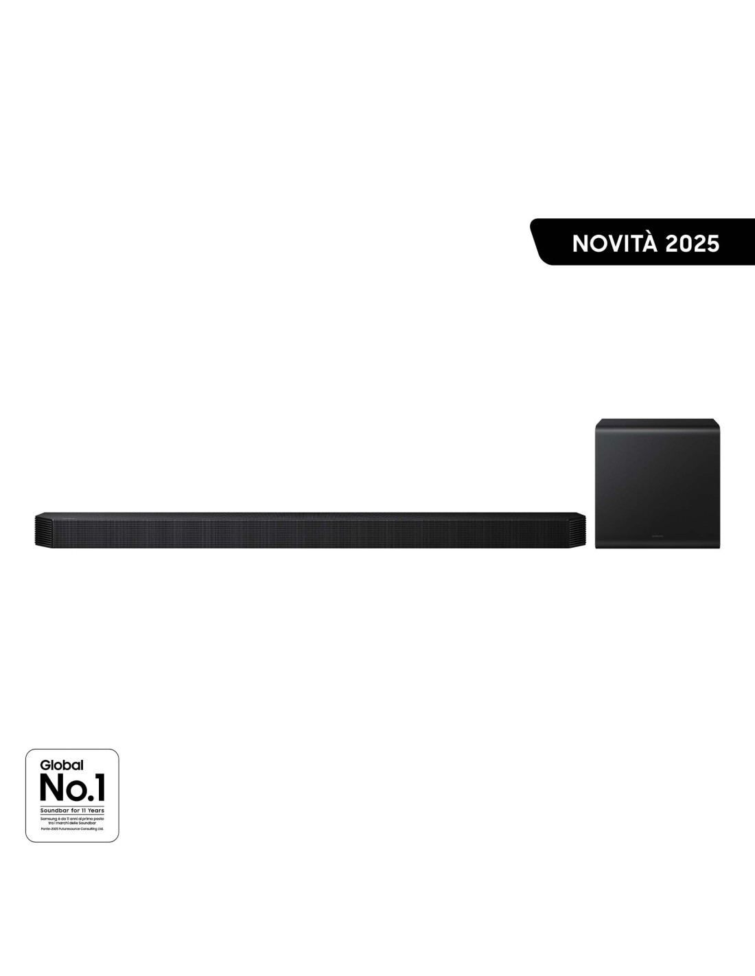 Samsung Soundbar HW-QS700F/ZF, Audio 3.1.2 canali, Wireless Dolby Atmos, 2025. Sistema audio: 3.1.2 canali, Potenza in uscita (RMS): 345 W, Formato audio integrato: DTS 5.1, DTS Virtual:X, Dolby Atmos, Dolby Digital Plus, Dolby TrueHD. Potenza RMS dell'altoparlante soundbar: 38 W. Tipo di subwoofer: Subwoofer attivo, Connettività del subwoofer: Wireless, Potenza RMS subwoofer: 160 W. Colore del prodotto: Nero, Nome del colore: Titan Black, Tecnologia High Dynamic Range (HDR): High Dynamic Range 10+ (HDR10 Plus). Tecnologia di connessione: Con cavo e senza cavo