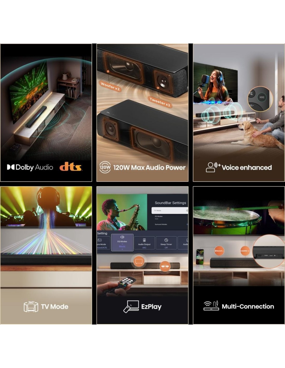 Hisense HS1000. Sistema audio: 2.0 canali, Potenza in uscita (RMS): 120 W, Formato audio integrato: DTS Virtual:X, Audio Dolby, Dolby Digital Plus. Colore del prodotto: Nero. Tecnologia di connessione: Cablato. Tensione di ingresso AC: 100-240 V, Frequenza di ingresso AC: 50-60 Hz, Consumo energetico del soundbar: 120 W. Larghezza: 702 mm, Profondità: 100 mm, Altezza: 57 mm