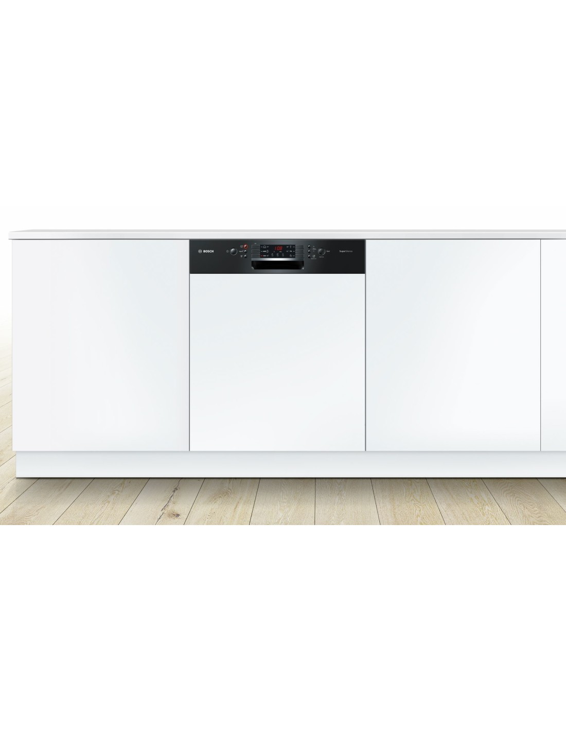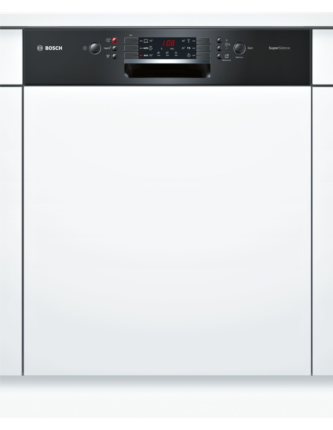 Bosch Serie 4 SMI46MB03E. Posizionamento dell'apparecchio: A scomparsa parziale, Dimensione: Dimensione massima (60 cm), Colore pannello di controllo: Nero. Numero di coperti: 14 coperti, Emissione acustica: 44 dB, Programmi speciali: 60min 65°C, Auto 45-65°C, Eco, Vetro/Delicati, Intensivo, Prelavaggio, Rapido. Regolazione piedini: 6 cm. Consumo di acqua per ciclo: 9,5 L, Consumo di energia per ciclo: 0,93 kWh, Carico di collegamento: 2400 W. Larghezza: 598 mm, Profondità: 573 mm, Altezza: 815 mm