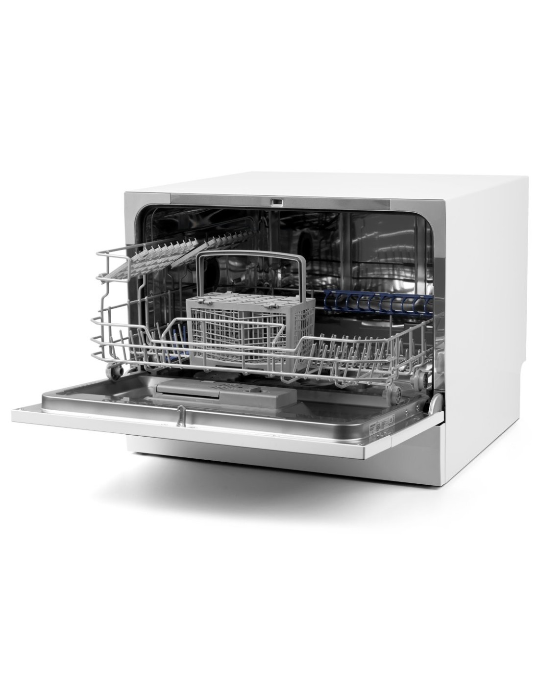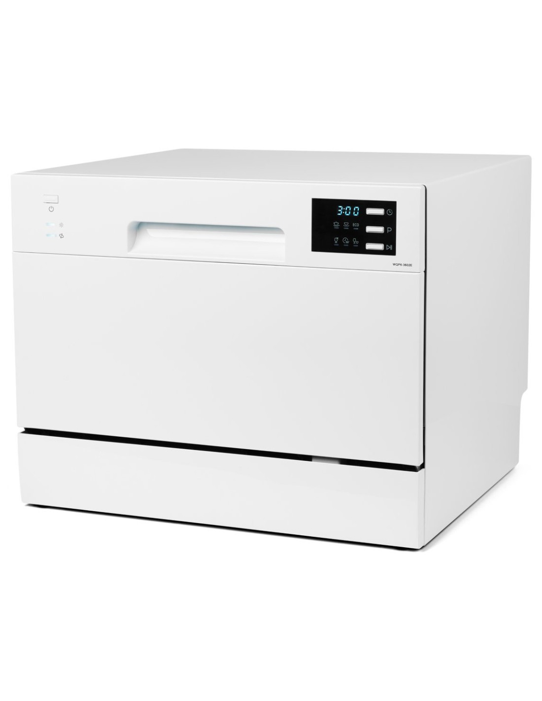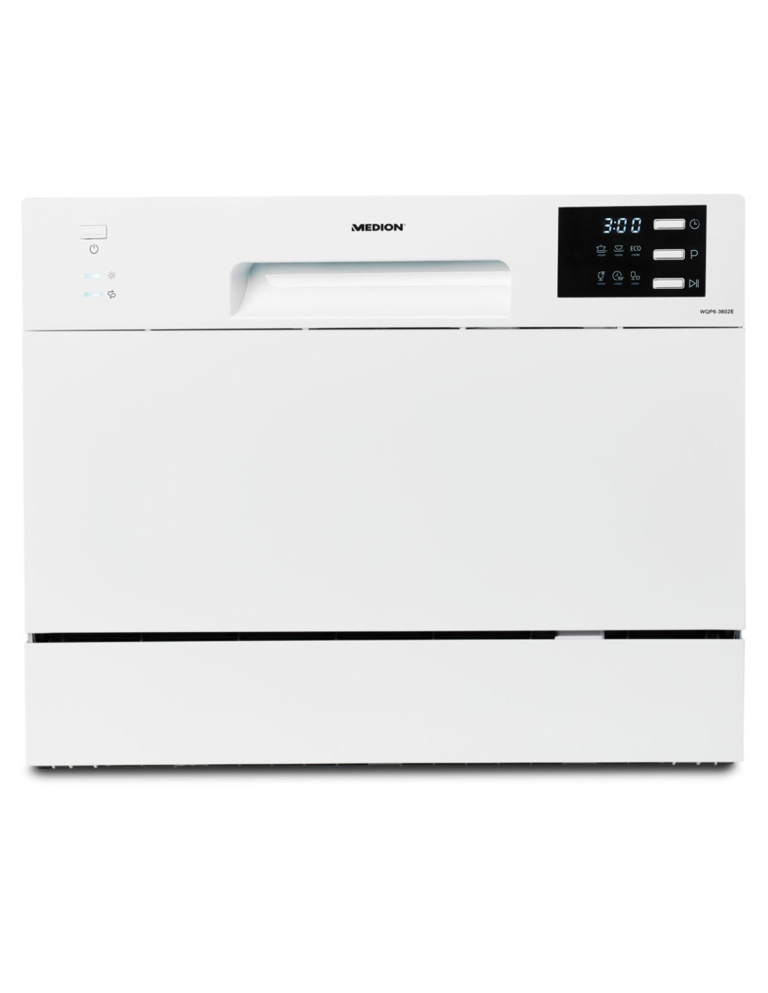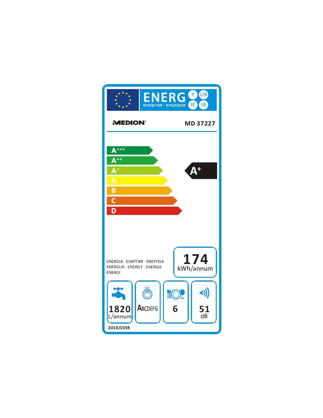MEDION MD 37227. Posizionamento dell'apparecchio: Superficie piana, Dimensione: Compatta, Colore della porta: Bianco. Numero di coperti: 6 coperti, Emissione acustica: 51 dB, Programmi speciali: Eco, Vetro/Delicati, Intensivo, Normale, Rapido. Consumo di acqua per ciclo: 6,5 L, Consumo di energia per ciclo: 0,62 kWh, Carico di collegamento: 1380 W. Larghezza: 555 mm, Profondità: 500 mm, Altezza: 438 mm. Classe efficacia di asciugatura: A, Consumo energetico annuo: 174 kWh, Consumo d'acqua totale annuo: 1820 L