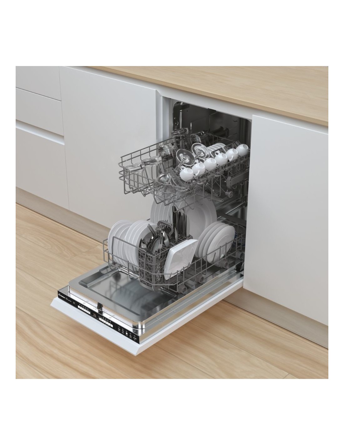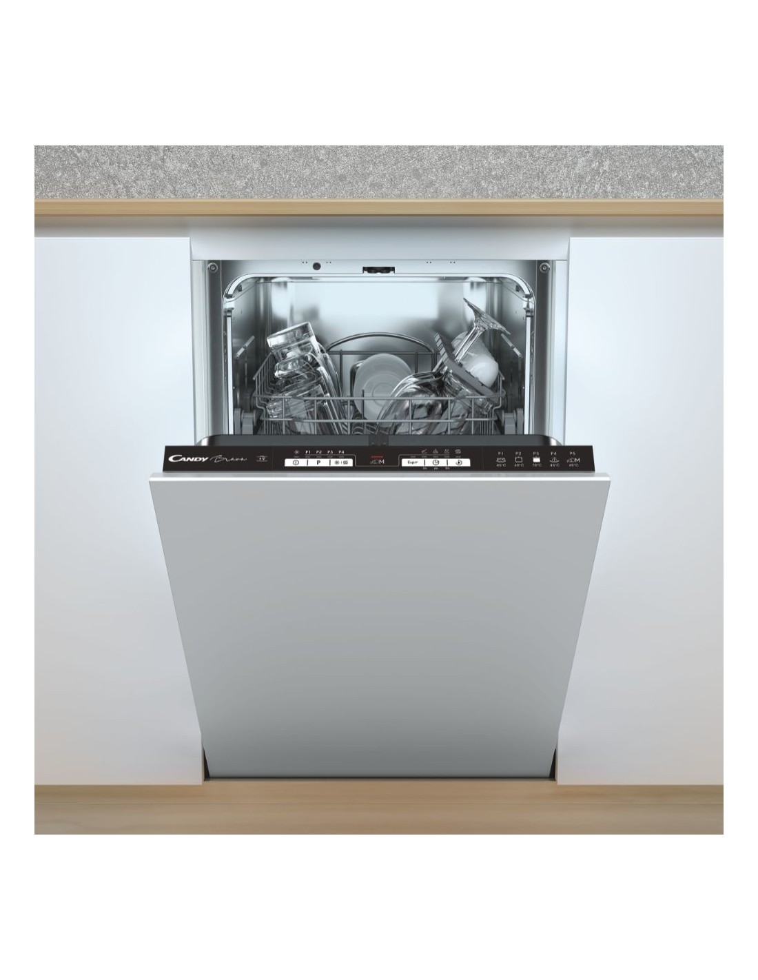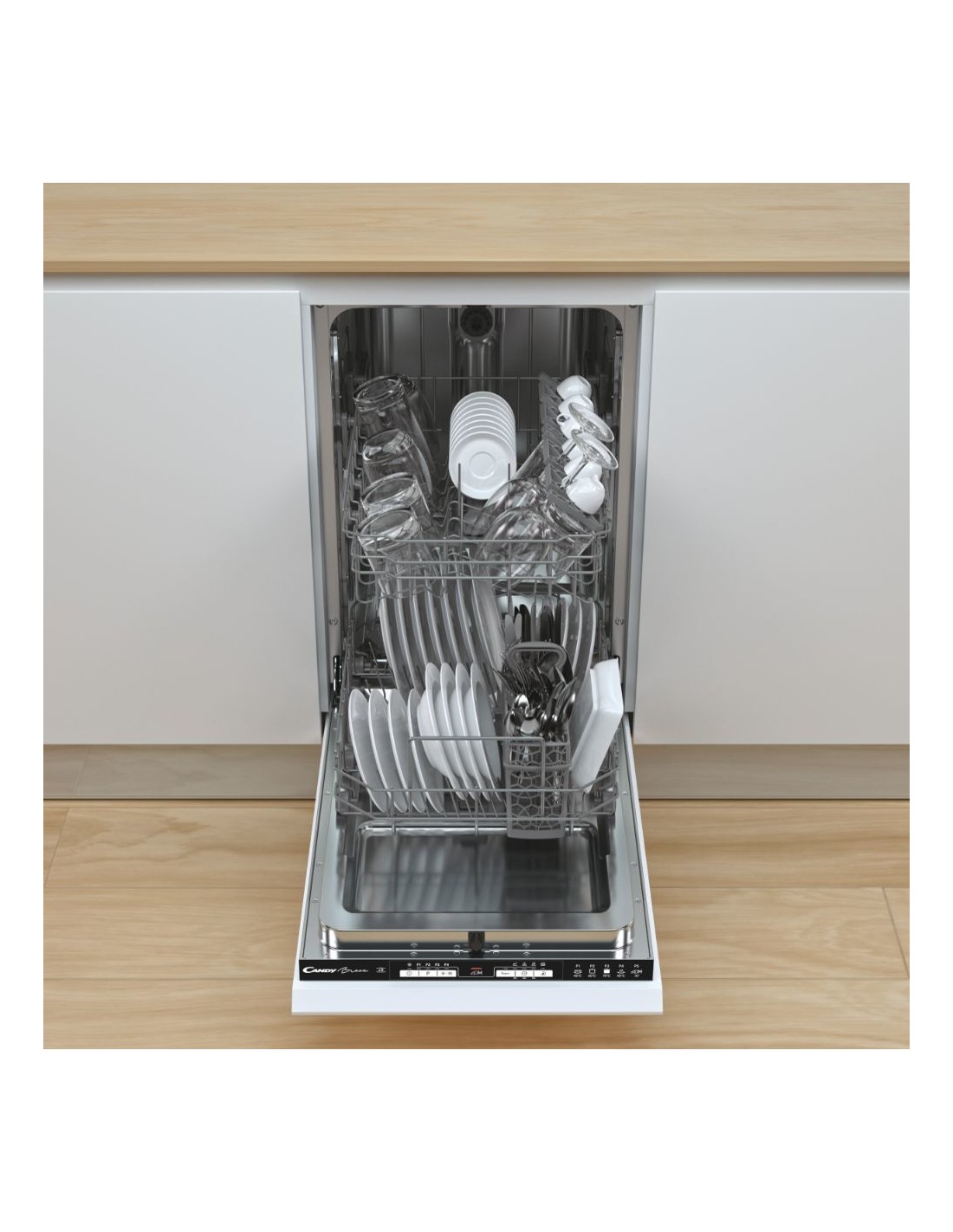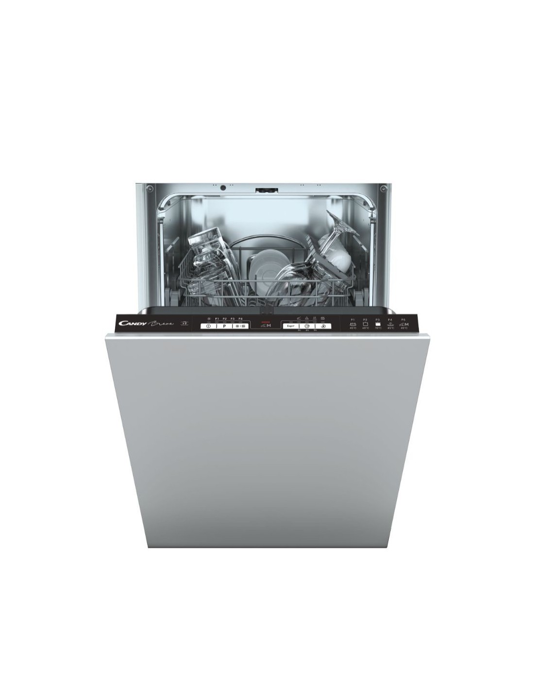 Candy Brava CDIH 1L949. Posizionamento dell'apparecchio: A scomparsa totale, Dimensione: Compatta (45 cm), Colore pannello di controllo: Nero. Numero di coperti: 9 coperti, Classe emissione rumore: C, Emissione acustica: 49 dB. Classe efficienza energetica: F, Consumo di acqua per ciclo: 9 L, Consumo energetico per 100 cicli: 78 kWh. Larghezza: 448 mm, Profondità: 555 mm, Altezza: 820 mm. Tipo di regolazione dei piedi: Posteriore