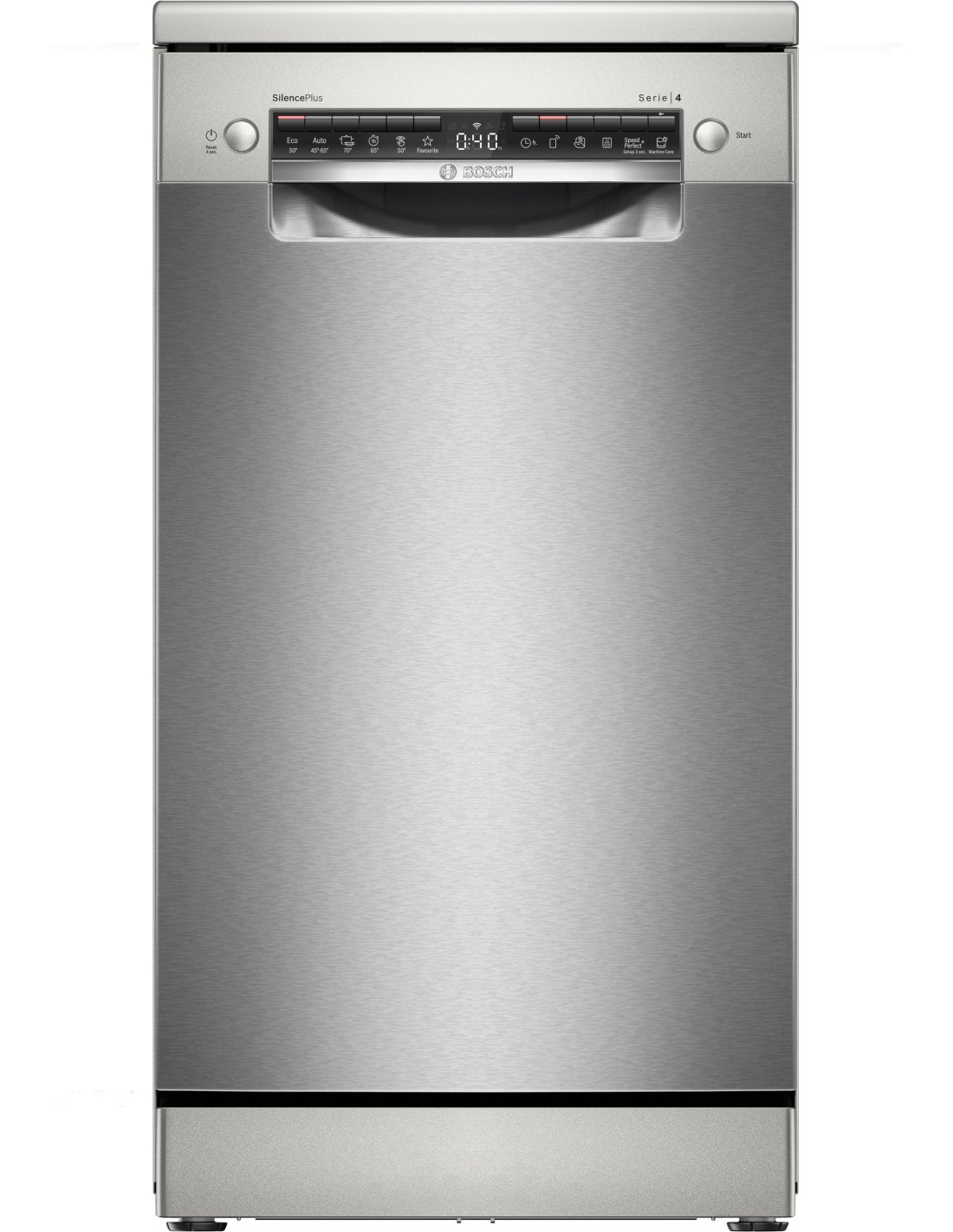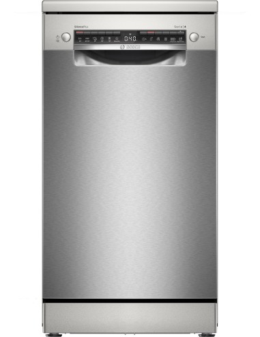 Bosch Serie 4 SPS4EMI24E Lavastoviglie da libera installazione 45 cm Acciaio Classe C. Posizionamento dell'apparecchio: Libera installazione, Dimensione: Compatta (45 cm), Colore della porta: Acciaio inox. Numero di coperti: 10 coperti, Classe emissione rumore: B, Emissione acustica: 44 dB. Regolazione piedini: 2 cm, Applicazioni per il controllo supportate: Bosch Home Connect. Classe efficienza energetica: C, Consumo di acqua per ciclo: 8,9 L, Consumo energetico per 100 cicli: 59 kWh. Larghezza: 450 mm, Profondità: 600 mm, Altezza: 845 mm