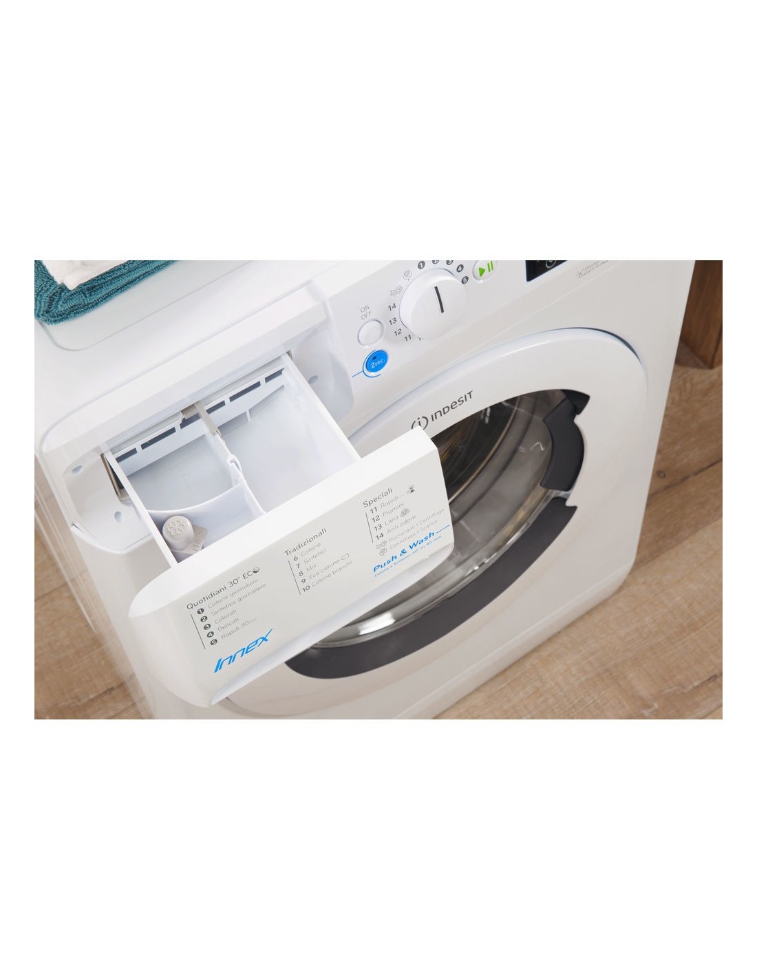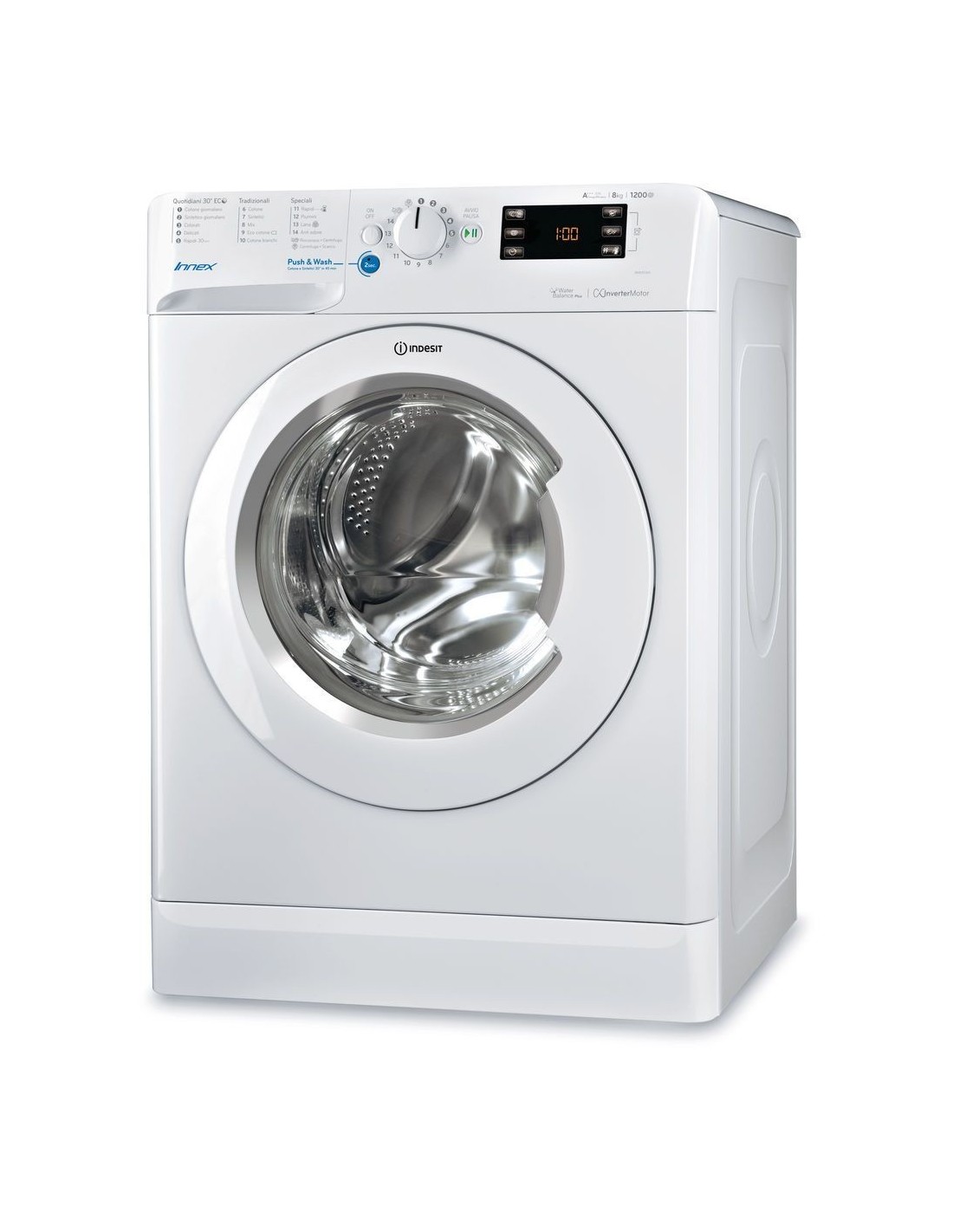 Caratteristiche di questa lavatrice a carica frontale a libera installazione Indesit: cestello spazioso da 8 kg. Classe energetica A+++, per una riduzione dei consumi di fino al 10%. Centrifuga a 1200 giri al minuto ad alta efficienza. Colore bianco.
