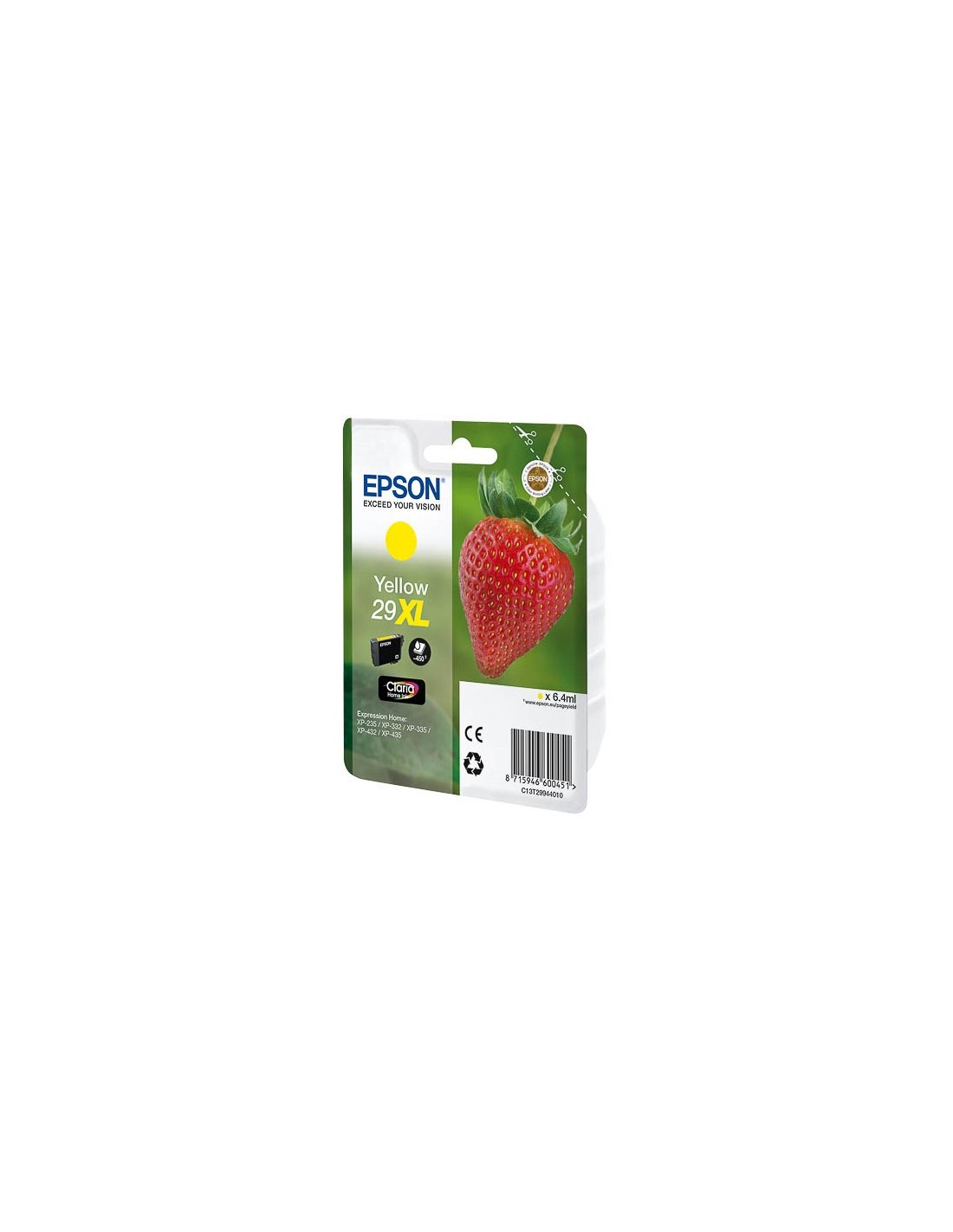 Epson Strawberry 29XL Y. Tipo di cartuccia: Resa elevata (XL), Colour ink type: Inchiostro a base di pigmento, Resa in pagine dell'inchiostro a colori: 450 pagine, Volume dell'inchiostro a colori: 6,4 ml, Quantità per pacco: 1 pz