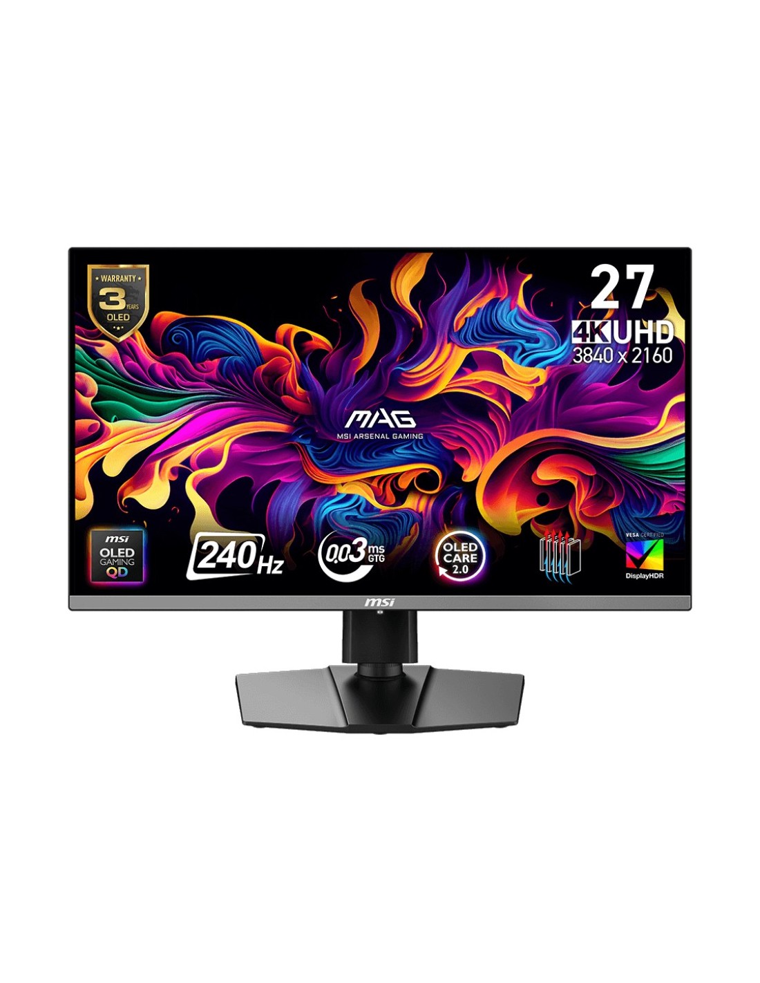 MSI MAG 272UP QD-OLED X24. Dimensioni diagonale schermo: 67,3 cm (26.5"), Risoluzione del display: 3840 x 2160 Pixel, Tipologia HD: 4K Ultra HD, Tecnologia display: QD-OLED, Tempo di risposta: 0,03 ms, Rapporto d'aspetto nativo: 16:9, Angolo di visualizzazione (orizzontale): 178°, Angolo di visualizzazione (verticale): 178°. Montaggio standard VESA, Regolazione altezza. Colore del prodotto: Nero