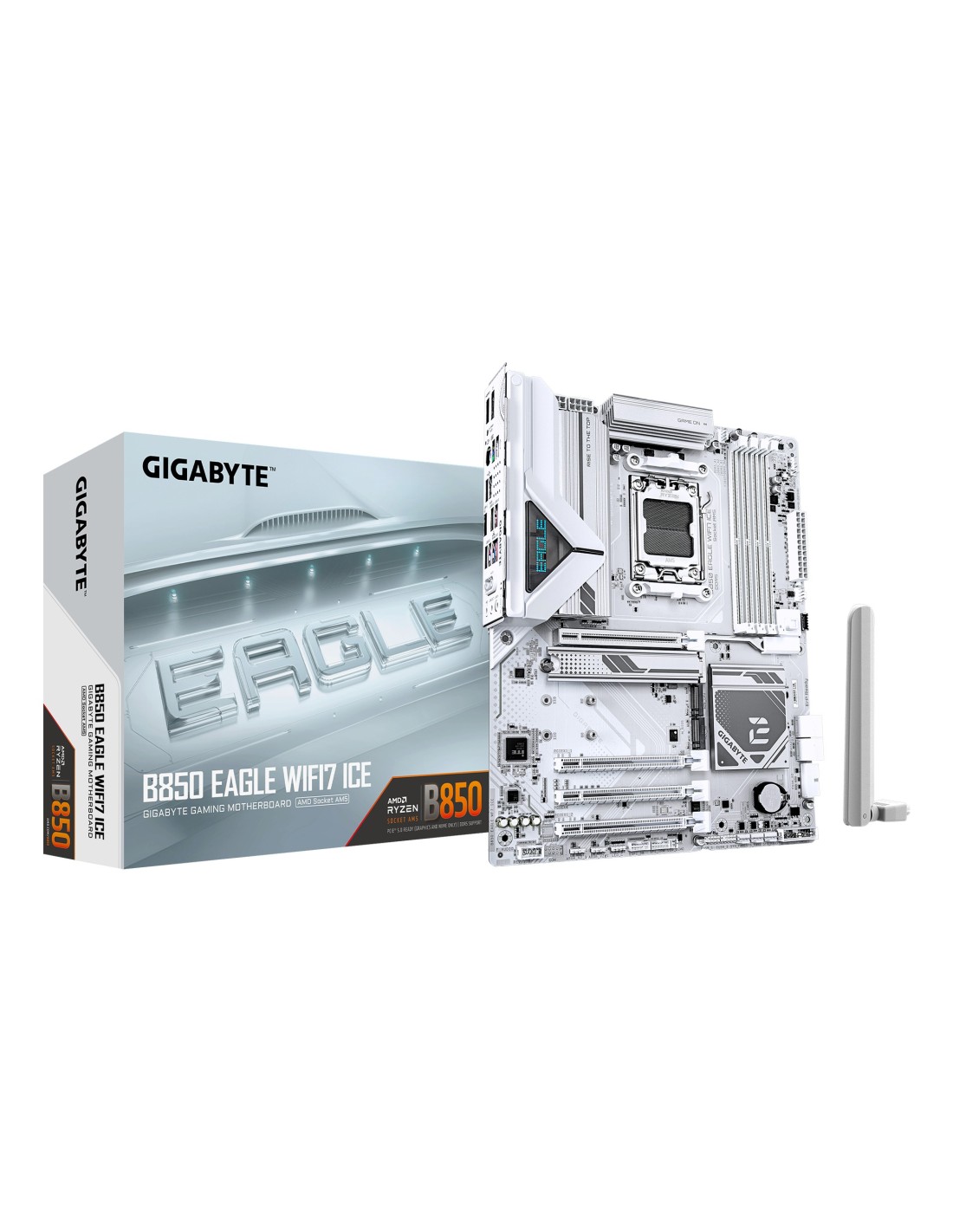 GIGABYTE B850 EAGLE WIFI7 ICE Scheda madre - CPU AMD Ryzen serie 9000, VRM digitale a 8+2+2 fasi, fino a 8200 MHz DDR5 (O.C.), 1x M.2 PCIe 5.0 + 2x M.2 PCIe 4.0, Wi-Fi 7, LAN 2.5 GbE, USB 3.2 Gen 2. Produttore processore: AMD, Presa per processore: Socket AM5, Processori compatibili: AMD Ryzen 7000 Series, AMD Ryzen 8000 Series, AMD Ryzen 9000 Series. Tipi di memoria supportati: DDR5-SDRAM, RAM massima supportata: 256 GB, tipo di slot di memoria: DIMM. Interfacce dell'unità di archiviazione supportate: M.2, PCI Express 4.0, PCI Express 5.0, SATA III, Tipi di unità di archiviazione supportate: HDD & SSD, Livelli RAID: 0, 1, 10. Risoluzione massima: 4096 x 2160 Pixel. Tipo di interfaccia Ethernet: 2.5 Gigabit Ethernet, Controller LAN: Realtek RTL8125, Wi-Fi standard: Wi-Fi 7 (802.11be)