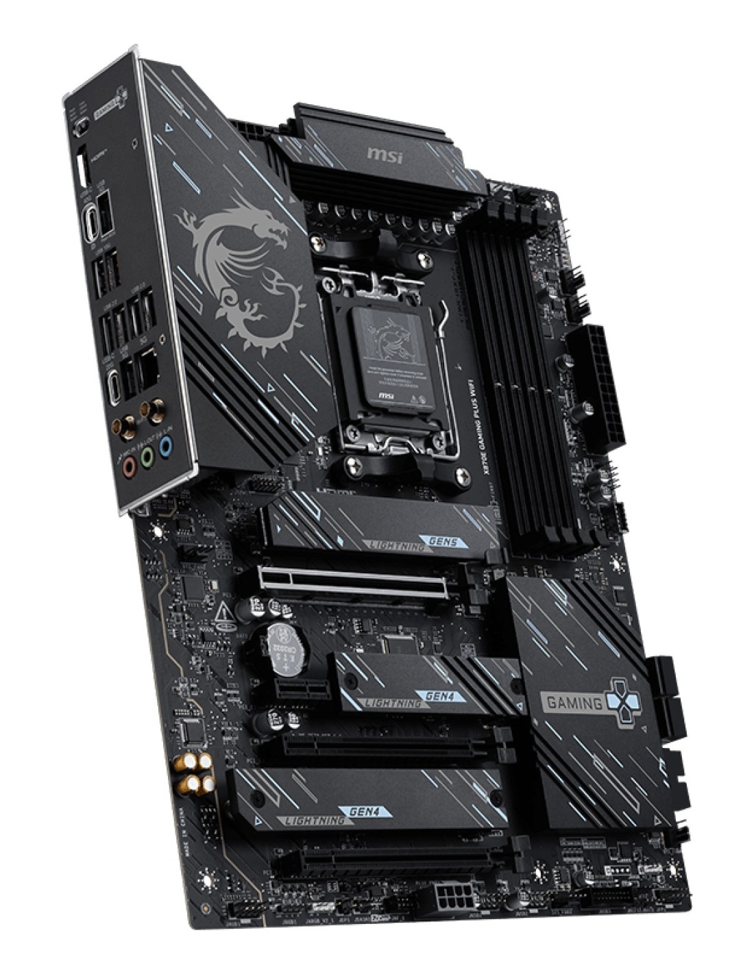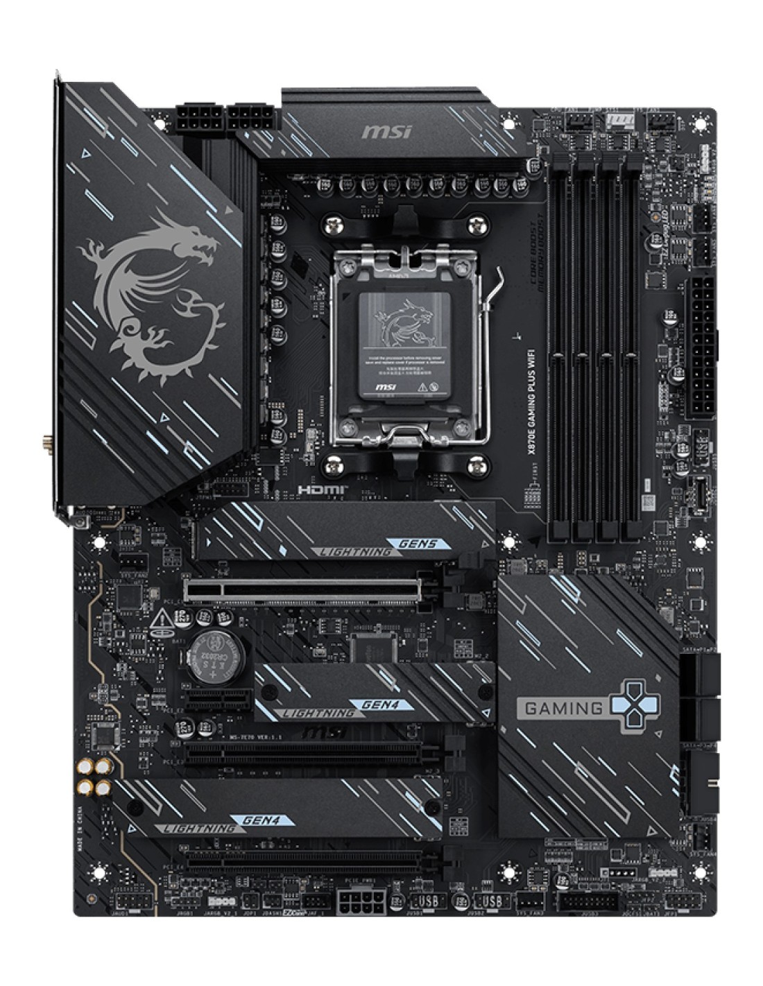 MSI X870E GAMING PLUS WIFI. Produttore processore: AMD, Presa per processore: Socket AM5, Processori compatibili: AMD Ryzen 7000 Series, AMD Ryzen 8000 Series, AMD Ryzen 9000 Series. Tipi di memoria supportati: DDR5-SDRAM, RAM massima supportata: 256 GB, tipo di slot di memoria: DIMM. Tipi di unità di archiviazione supportate: HDD, Livelli RAID: 0, 1, 5, 10. Risoluzione massima: 3840 x 2160 Pixel. Tipo di interfaccia Ethernet: 5 Gigabit Ethernet, Wi-Fi standard: Wi-Fi 7 (802.11be), Standard Wi-Fi: 802.11a, 802.11b, 802.11g, Wi-Fi 4 (802.11n), Wi-Fi 5 (802.11ac), Wi-Fi 6 (802.11ax), Wi-Fi 6E...