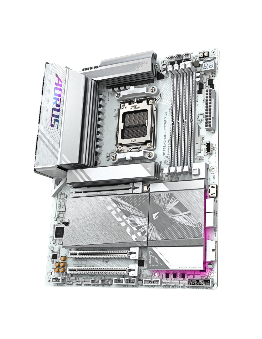 GIGABYTE X870E AORUS ELITE WIFI7 ICE Scheda madre - Supporta CPU AMD Ryzen 9000, VRM digitale a 16+2+2 fasi, fino a 8200 MHz DDR5 (O.C.), 3x PCIe 5.0 + 1x PCIe 4.0, Wi-Fi 7, LAN 2.5 GbE, USB 4. Produttore processore: AMD, Presa per processore: Socket AM5, Processori compatibili: AMD Ryzen 7000 Series, AMD Ryzen 8000 Series, AMD Ryzen 9000 Series. Tipi di memoria supportati: DDR5-SDRAM, RAM massima supportata: 256 GB, tipo di slot di memoria: DIMM. Interfacce dell'unità di archiviazione supportate: M.2, PCI Express 5.0, SATA III, Tipi di unità di archiviazione supportate: HDD & SSD, Livelli RAID: 0, 1, 5, 10. Risoluzione massima: 4096 x 2160 Pixel. Tipo di interfaccia Ethernet: 2.5 Gigabit Ethernet, Controller LAN: Realtek RTL8125, Wi-Fi standard: Wi-Fi 7 (802.11be)