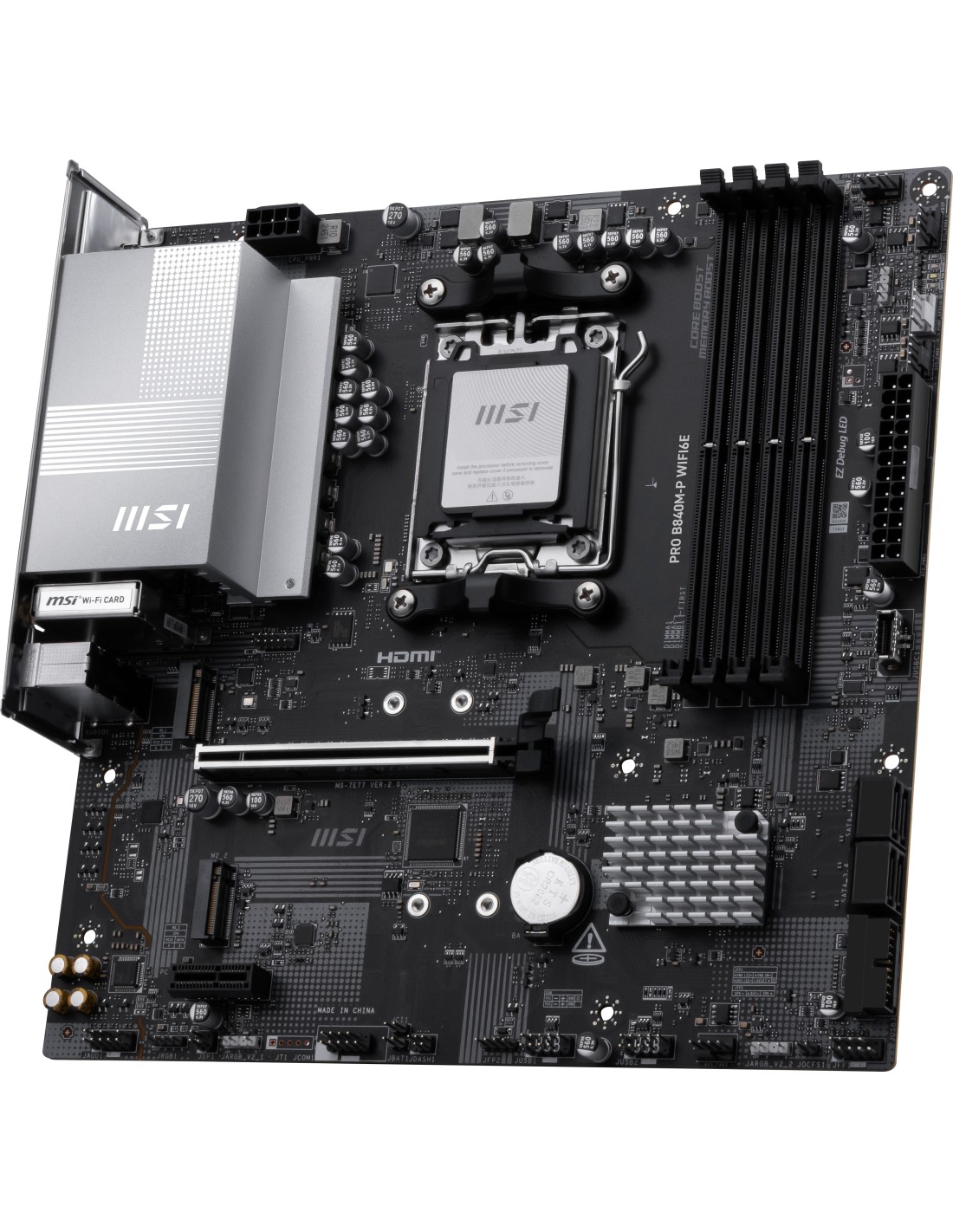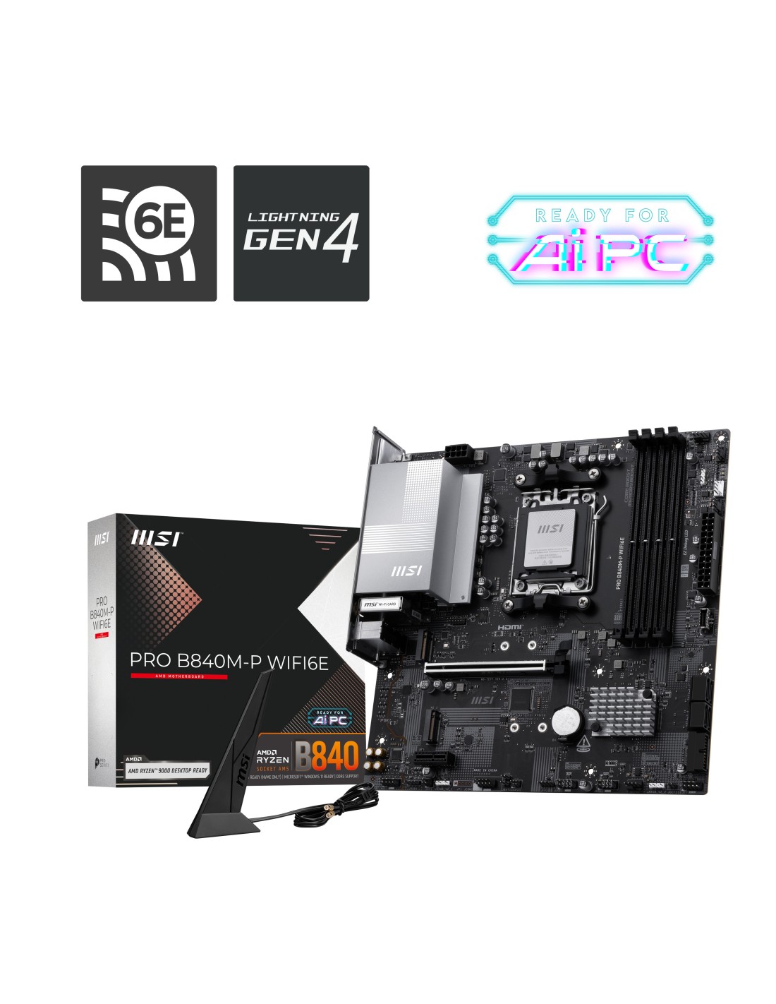MSI PRO B840M-P WIFI6E. Produttore processore: AMD, Presa per processore: Socket AM5, Processori compatibili: AMD Ryzen 7000 Series, AMD Ryzen 8000 Series, AMD Ryzen 9000 Series. Tipi di memoria supportati: DDR5-SDRAM, RAM massima supportata: 256 GB, tipo di slot di memoria: DIMM. Interfacce dell'unità di archiviazione supportate: M.2, Micro SATA III, Tipi di unità di archiviazione supportate: HDD & SSD, Livelli RAID: 0, 1, 10. Tipo di interfaccia Ethernet: 2.5 Gigabit Ethernet, Controller LAN: Realtek RTL8125D, Wi-Fi standard: Wi-Fi 6E (802.11ax). Componente per: PC, Fattore di forma scheda madre: micro ATX, Famiglia di chipset per scheda madre: AMD