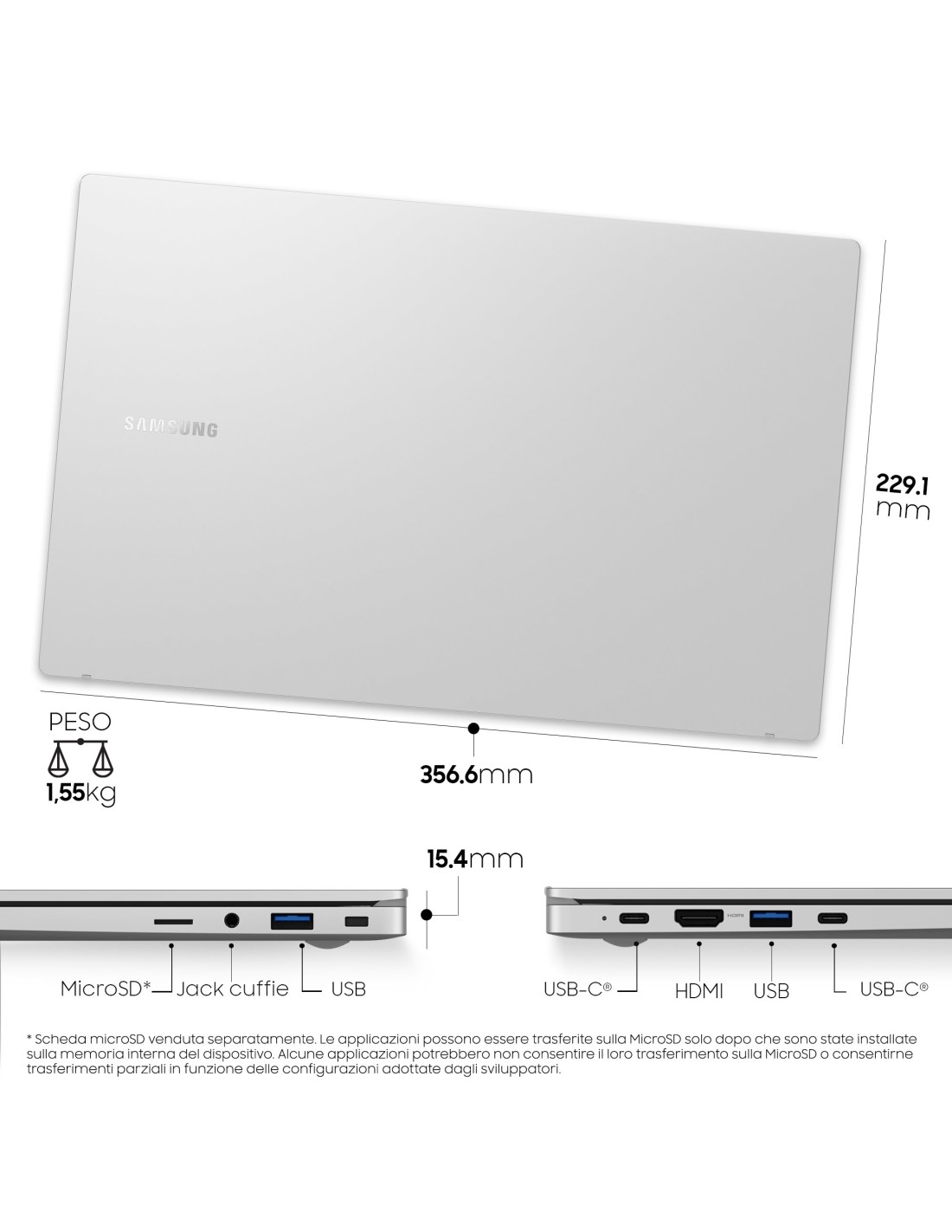 Samsung Galaxy Book , 15.6”, Windows 11 ready, Intel Core i7, 16 GB RAM, 512 GB SSD, Mystic Silver. Tipo di prodotto: Computer portatile, Fattore di forma: Convertibile (a cartella). Famiglia processore: Intel® Core™ i7, Modello del processore: i7-1165G7, Frequenza del processore: 2,8 GHz. Dimensioni schermo: 39,6 cm (15.6"), Tipologia HD: Full HD, Risoluzione del display: 1920 x 1080 Pixel. RAM installata: 16 GB, Tipo di RAM: LPDDR4x-SDRAM. Capacità totale di archiviazione: 512 GB, Supporto di memoria: SSD. Modello scheda grafica integrata: Intel Iris Xe Graphics. Sistema operativo incluso: Windows 10. Colore del prodotto: Argento