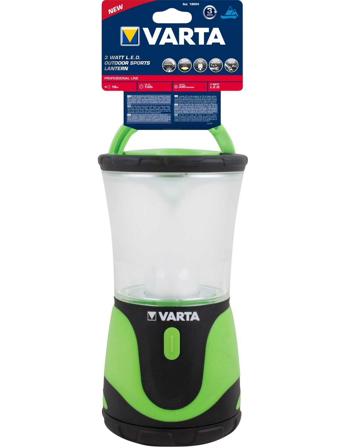 Varta 18664101111. Colore del prodotto: Nero, Verde, Codice di protezione internazionale (IP): IPX4. Tipo di lampada: LED, Potenza lampadina: 3 W, Colore della luce: Bianco. Durata batteria: 130 h. Profondità: 185 mm, Peso: 857 g