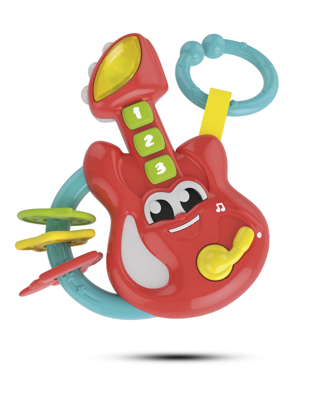 Un sonaglino perfetto per i piccoli musicisti di domani! Questa simpatica chitarra con 3 tastoni in gomma farà divertire il bambino suonando divertenti melodie, e lo porterà alla scoperta dei primi numeri con tante musichette. Con 3 pendagli in morbida gomma da mordicchiare, perfetti per la fase della dentizione e un pratico gancio per appendere il sonaglino. Stimola la manualità e la percezione uditiva dei più piccoli.