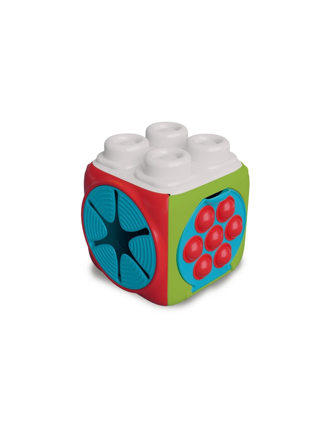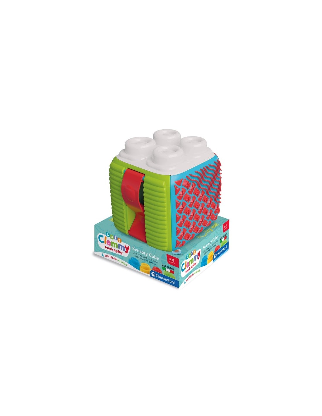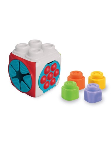 Un cubo ricco di texture in rilievo da esplorare, tante attività per stimolare la manualità del bambino e 4 morbidi mattoncini con cui giocare.