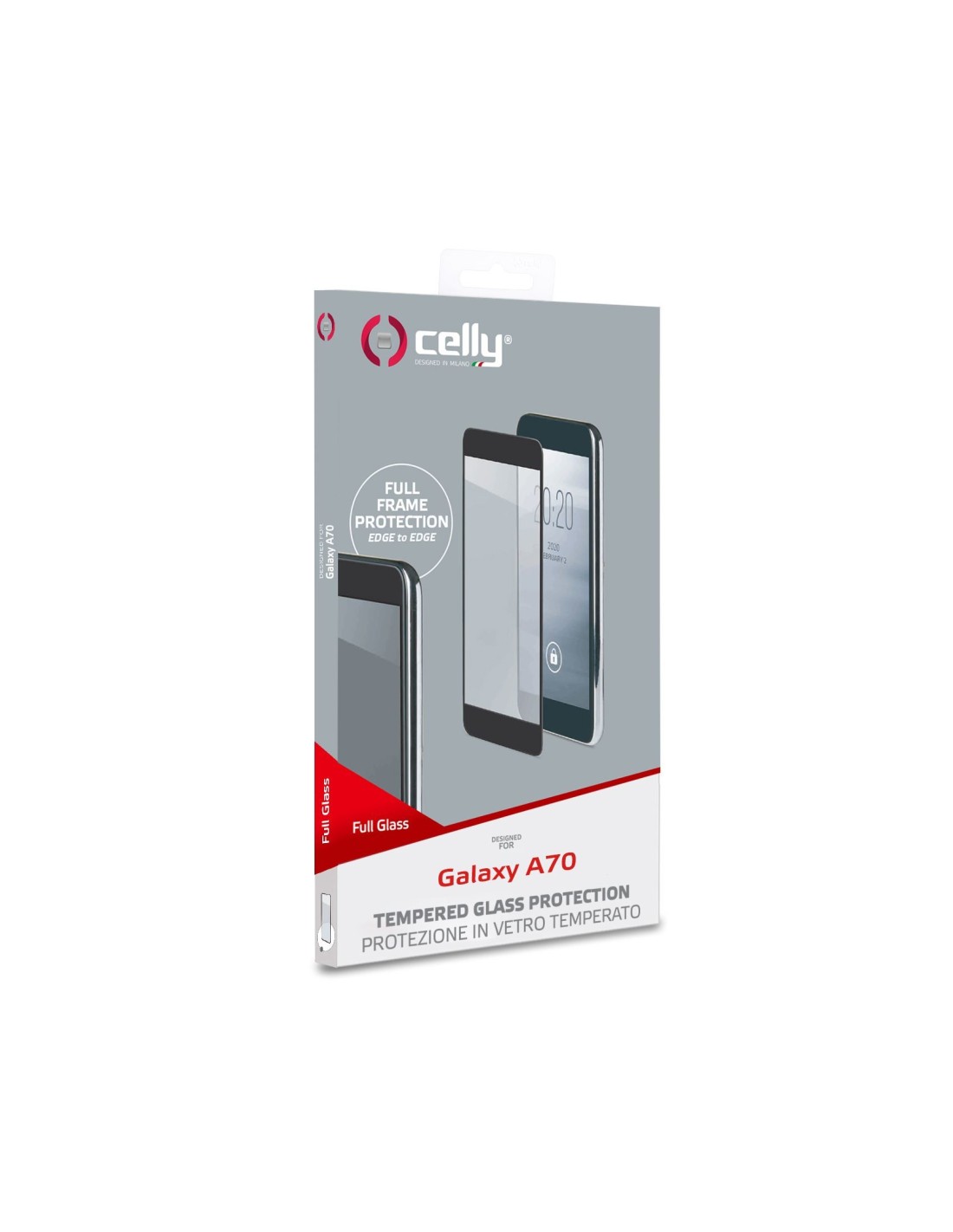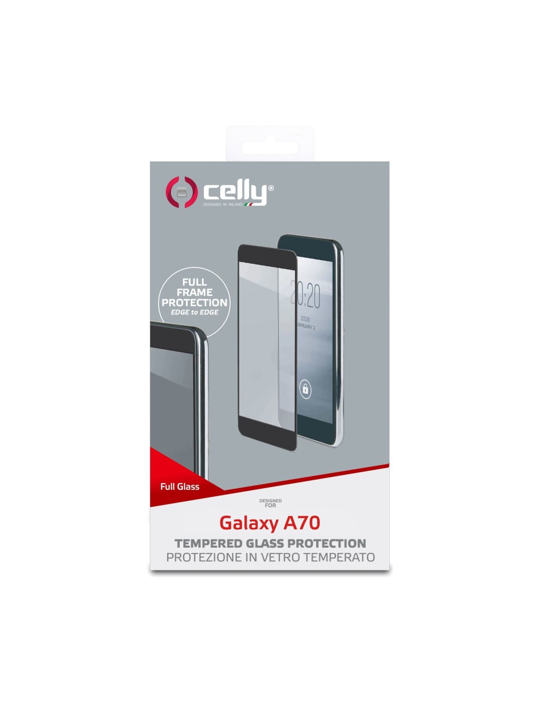 Celly Full Glass. Compatibilità marca: Samsung, Compatibilità: Galaxy A70, Funzioni di protezione: Scratch resistant. Materiali: Vetro temperato, Colore del prodotto: Nero, Trasparente. Quantità per pacco: 1 pz