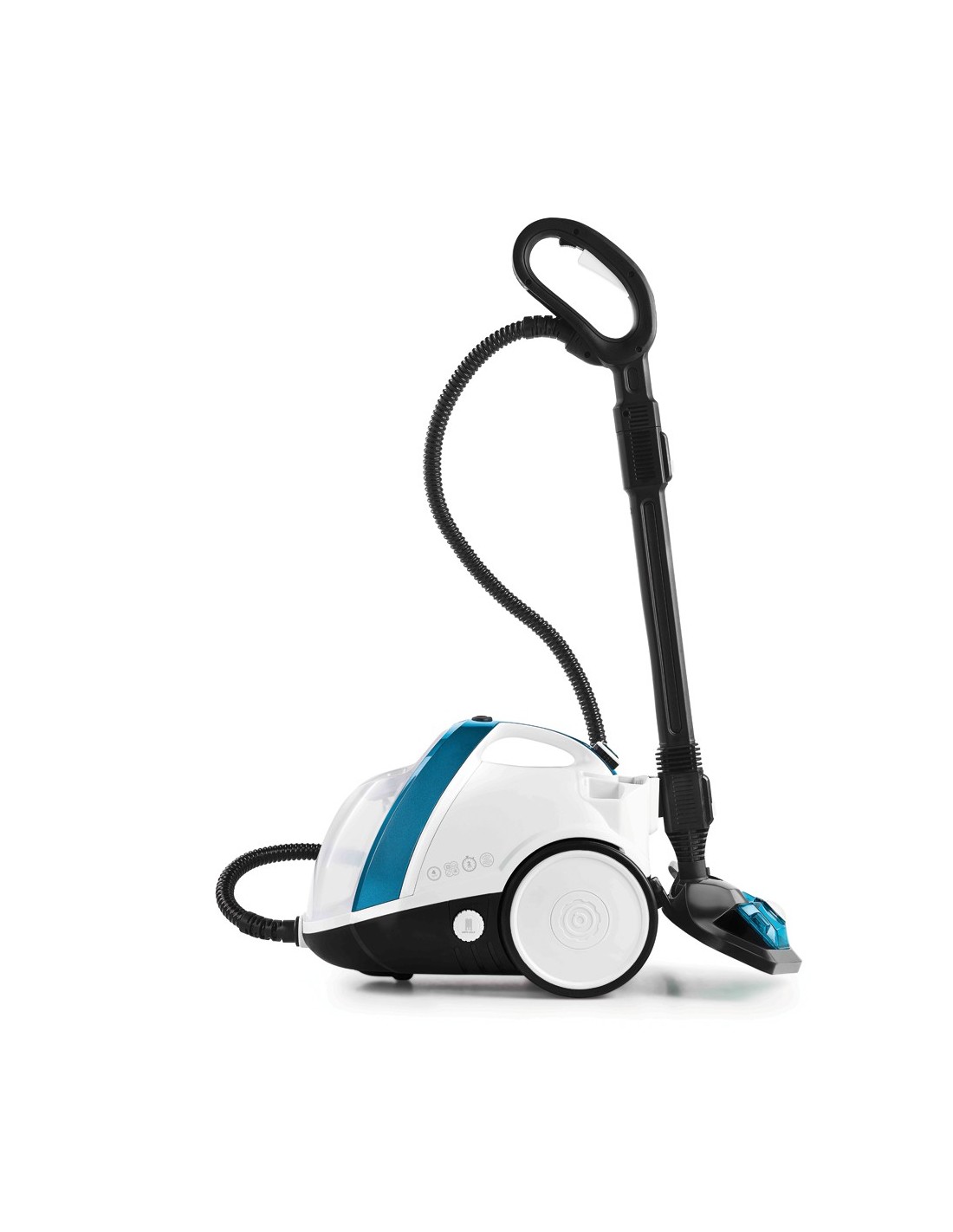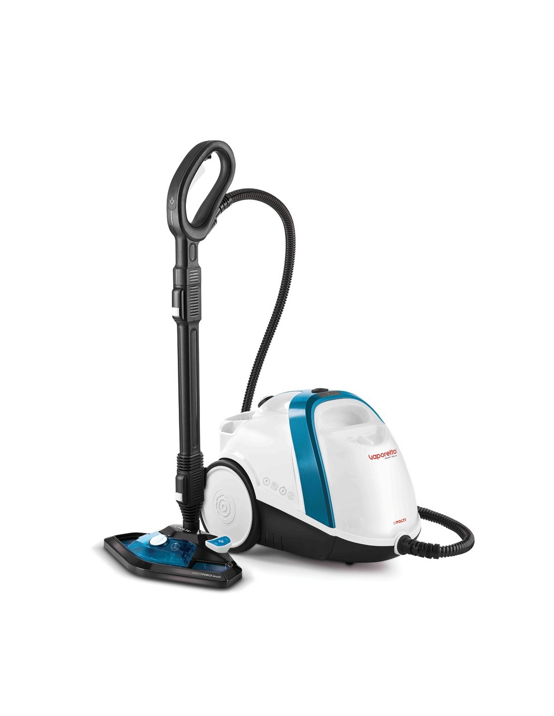 Polti Vaporetto Smart 100_B. Tipo: Pulitore a vapore cilindrico, Colore del prodotto: Blu, Bianco, Tipo di controllo: Pulsanti. Potenza: 1500 W. Superficie di pulizia: Vetro, Superfici rigide, Laminato, Piastrelle, Tempo di riscaldamento: 120 s, Raggio d'azione: 7,5 m. Peso: 5 kg, Larghezza: 400 mm, Profondità: 270 mm. Numero di accessori inclusi: 9 pz