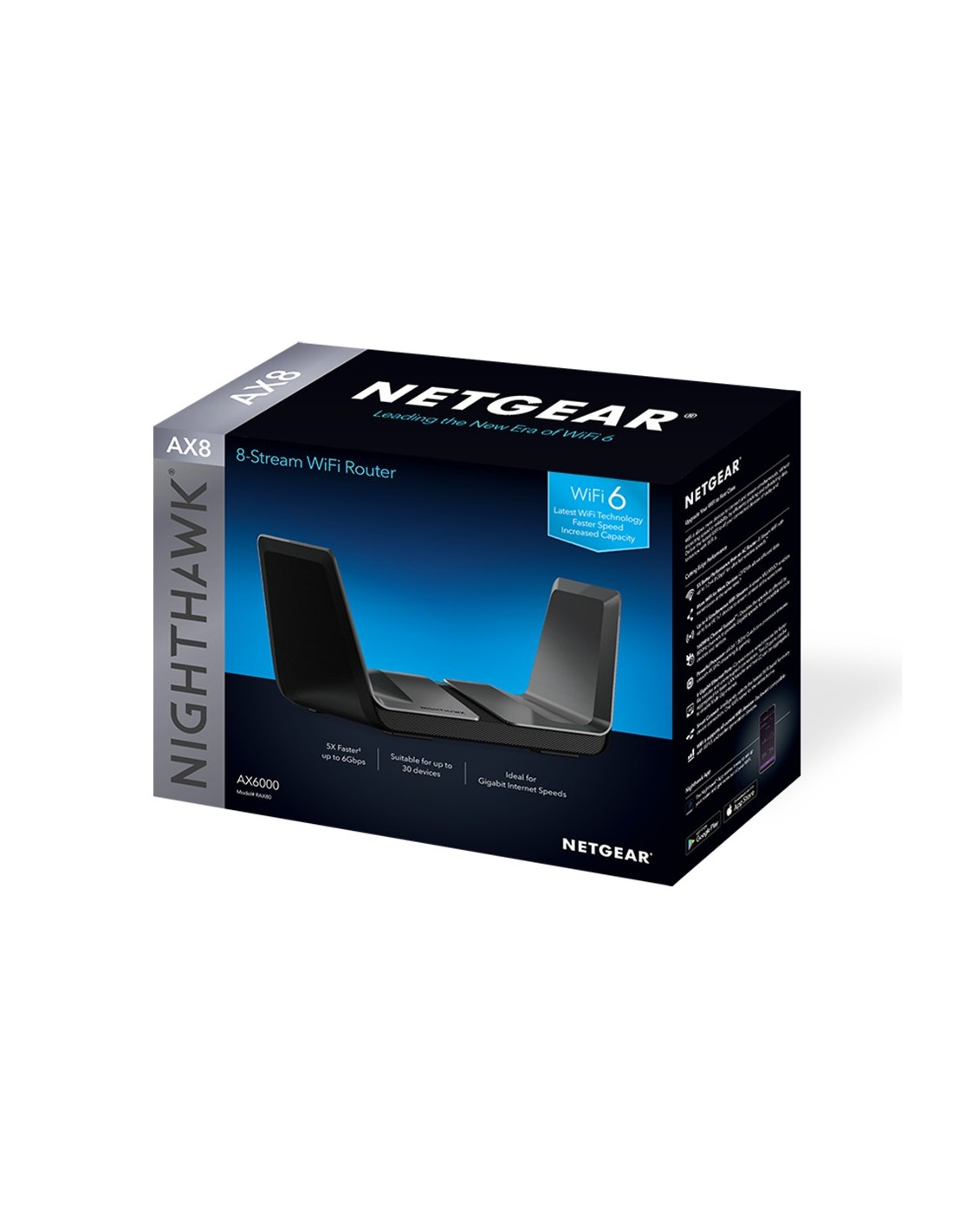 NETGEAR Nighthawk AX8. Tipo di connessione WAN: RJ-45. Banda Wi-Fi: Dual-band (2.4 GHz/5 GHz), Wi-Fi standard: Wi-Fi 6 (802.11ax), Intervallo di trasferimento dei dati WLAN (max): 6000 Mbit/s. Tipo di interfaccia LAN Ethernet: Gigabit Ethernet, Velocità trasferimento Ethernet LAN: 10,100,1000 Mbit/s, Tecnologia di cablaggio: 10/100/1000Base-T(X). Generazione di reti mobili: 4G. Algoritmi di sicurezza supportati: 128-bit AES,WPA,WPA2,WPA2-PSK