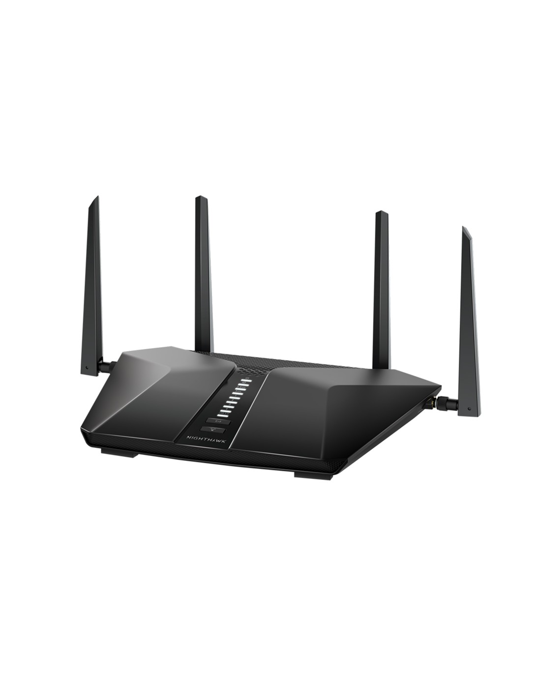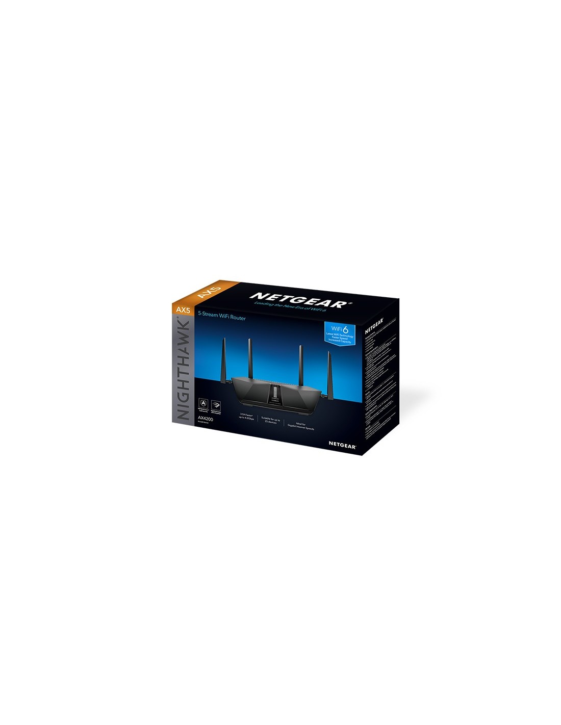 NETGEAR Nighthawk AX5 5-Stream AX4200 WiFi Router (RAX43). Tipo di connessione WAN: RJ-45. Banda Wi-Fi: Dual-band (2.4 GHz/5 GHz), Wi-Fi standard: Wi-Fi 6 (802.11ax), Intervallo di trasferimento dei dati WLAN (max): 4177 Mbit/s. Tipo di interfaccia LAN Ethernet: Gigabit Ethernet, Velocità trasferimento Ethernet LAN: 10,100,1000 Mbit/s, Standard di rete: IEEE 802.11a, IEEE 802.11ac, IEEE 802.11ax, IEEE 802.11b, IEEE 802.11g, IEEE 802.11i, IEEE 802.11n. Algoritmi di sicurezza supportati: 128-bit AES, WPA2, WPA3. Tipo di prodotto: Router da tavolo, Colore del prodotto: Nero