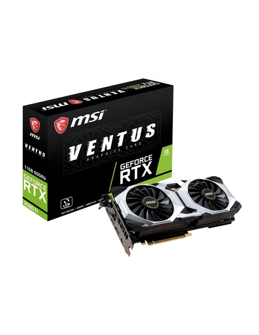 MSI V371-040R. Processore grafico / fornitore: NVIDIA, Processore grafico: GeForce RTX 2080 Ti, Frequenza del processore: 1350 MHz. Memoria Grafica Dedicata: 11 GB, Tipo memoria adattatore grafico: GDDR6, Ampiezza dati: 352 bit. Risoluzione massima: 7680 x 4320 Pixel. Versione DirectX: 12.0, Versione OpenGL: 4.5. Tipo interfaccia: PCI Express x16 3.0. Tipo di raffreddamento: Attivo, Numero di ventole: 2 ventola(e)