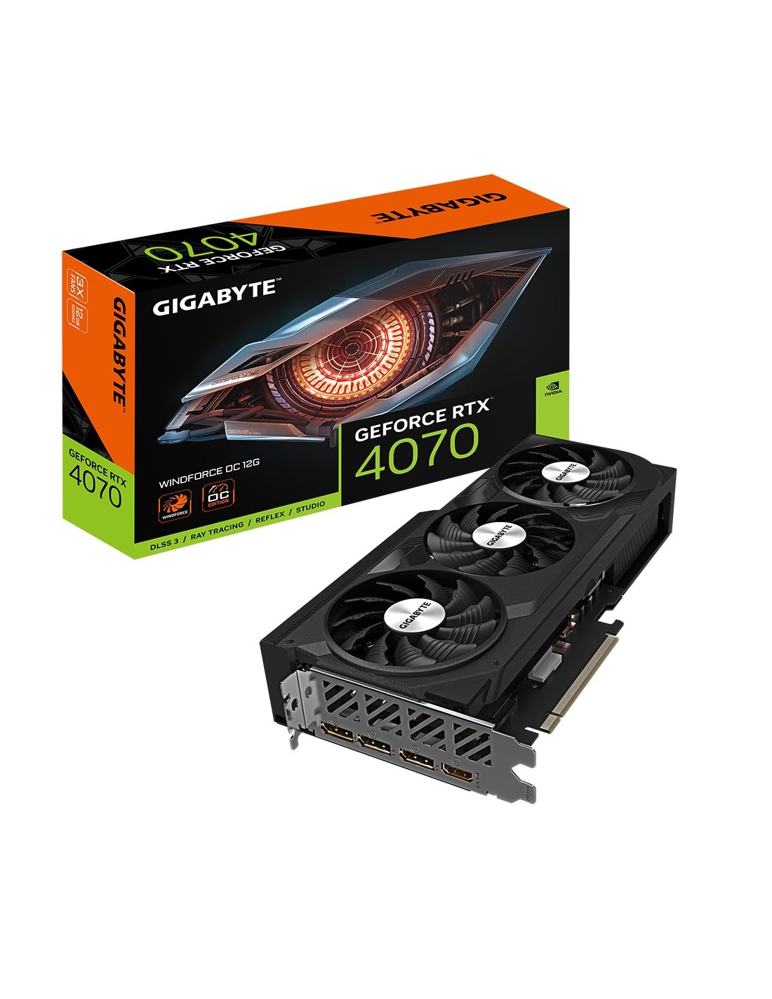 Gigabyte GV-N4070WF3OC-12GD. Processore grafico / fornitore: NVIDIA, Processore grafico: GeForce RTX 4070, Frequenza del processore: 2100 MHz. Memoria Grafica Dedicata: 12 GB, Tipo memoria adattatore grafico: GDDR6X, Ampiezza dati: 192 bit. Risoluzione massima: 7680 x 4320 Pixel. Versione DirectX: 12 Ultimate, Versione OpenGL: 4.6. Tipo interfaccia: PCI Express 4.0. Tipo di raffreddamento: Attivo, Numero di ventole: 3 ventola(e)
