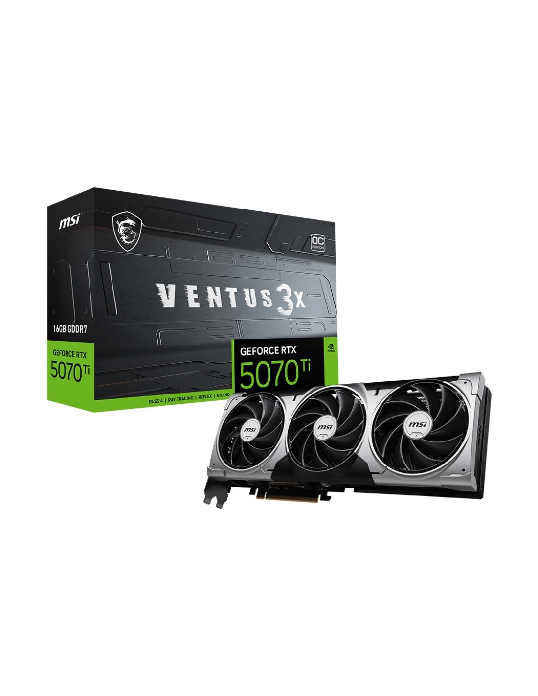 MSI GeForce RTX 5070 Ti 16G VENTUS 3X OC. Processore grafico / fornitore: NVIDIA, Processore grafico: GeForce RTX 5070 Ti, Frequenza del processore: 2497 MHz. Memoria Grafica Dedicata: 16 GB, Tipo memoria adattatore grafico: GDDR7, Ampiezza dati: 256 bit. Risoluzione massima: 7680 x 4320 Pixel. Versione DirectX: 12 Ultimate, Versione OpenGL: 4.6. Tipo interfaccia: PCI Express 5.0. Tipo di raffreddamento: Attivo, Numero di ventole: 3 ventola(e)